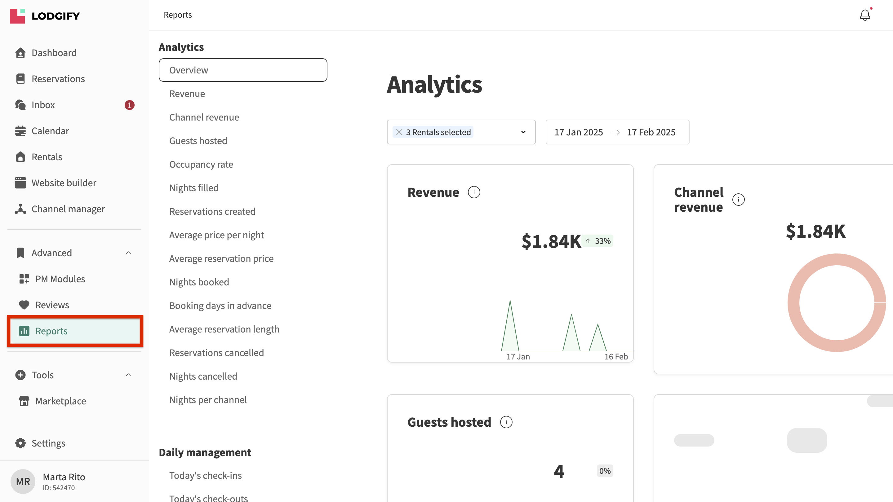 - On the top left you can access different sections (guests hosted, occupancy etc).