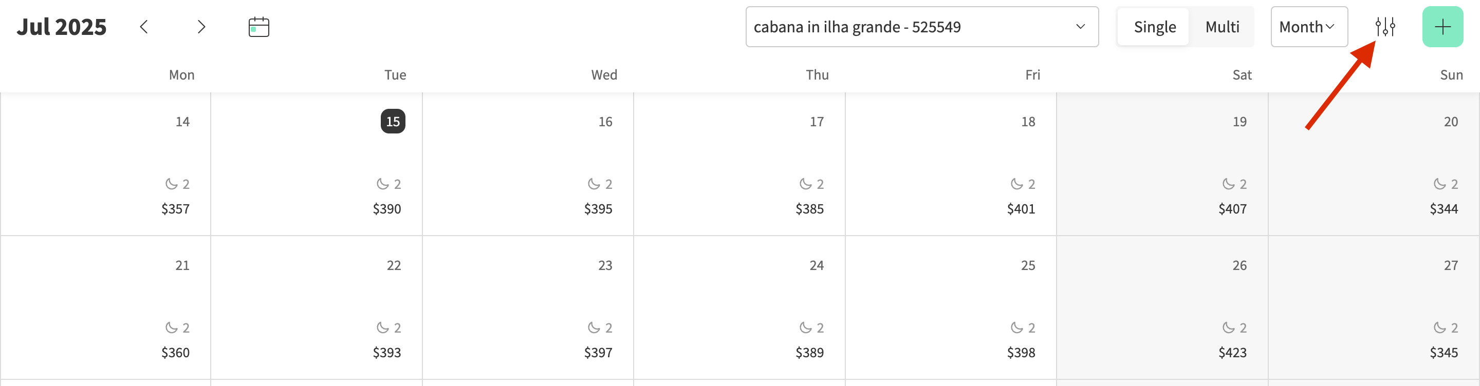 At the top right, you can choose how you want the week to start (Monday or Sunday) and if you want pricing and minimum stay showing for each night.