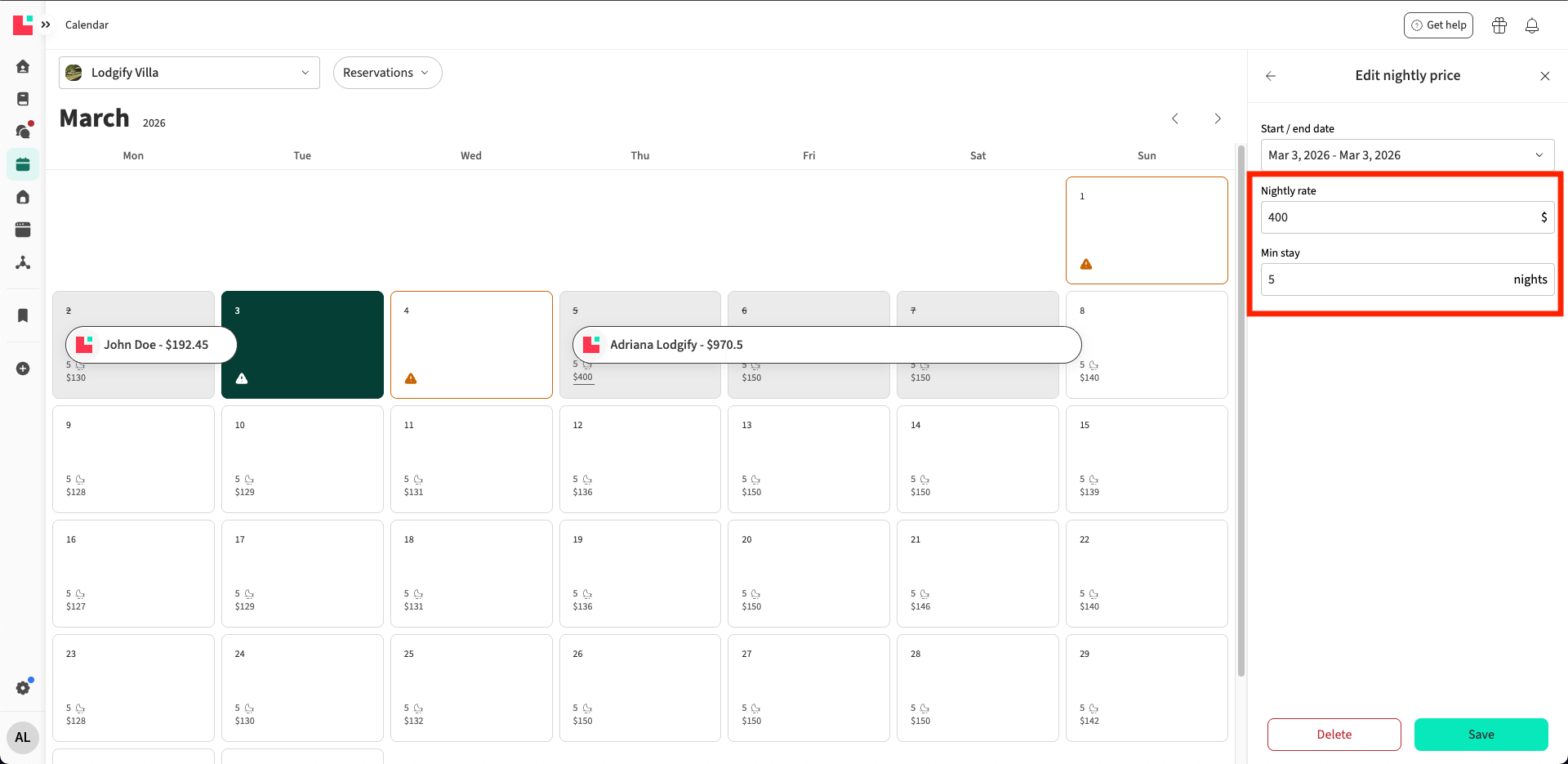 Get alerted when the system detects unbookable gaps in your calendar caused by minimum stay restrictions. For example, if two available nights fall between bookings but your minimum stay is set to more than two nights, a warning icon will appear on those dates. |