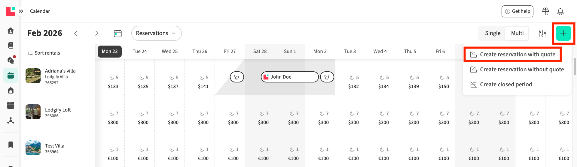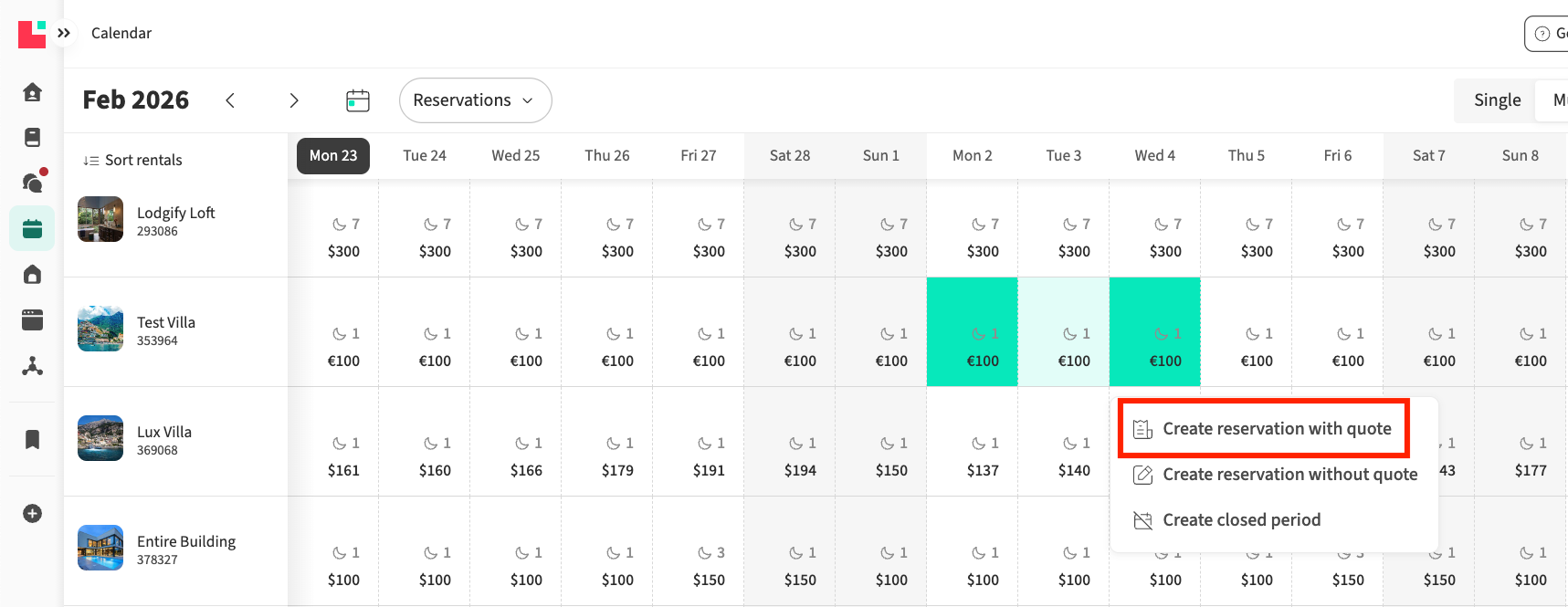 - If you stay on the Single rental calendar view, you can also create a reservation with quote: