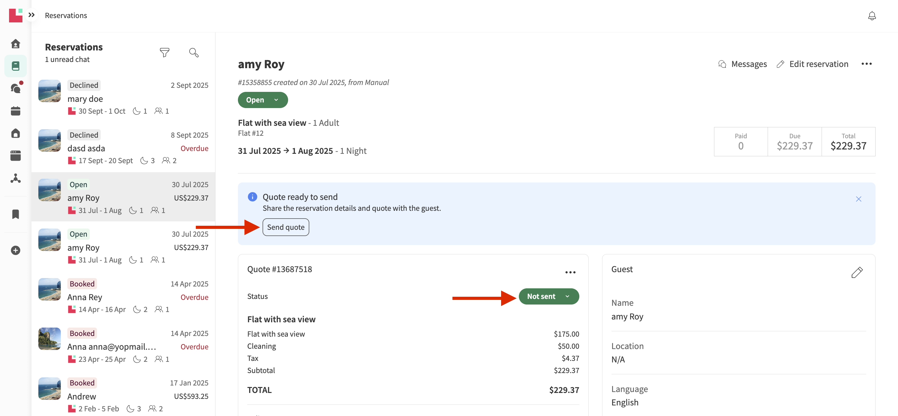 - Then, return to your reservation and resend the quote by clicking Send quote on the blue banner, or by selecting Not sent and choosing Send quote.