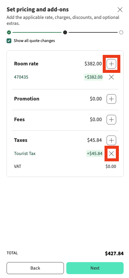 💡 Note: On the mobile application you can also set a default guest number. - On the following page, review the price details and add-ons. You can use the Plus or Cross icons if you need to modify anything, then click Next.