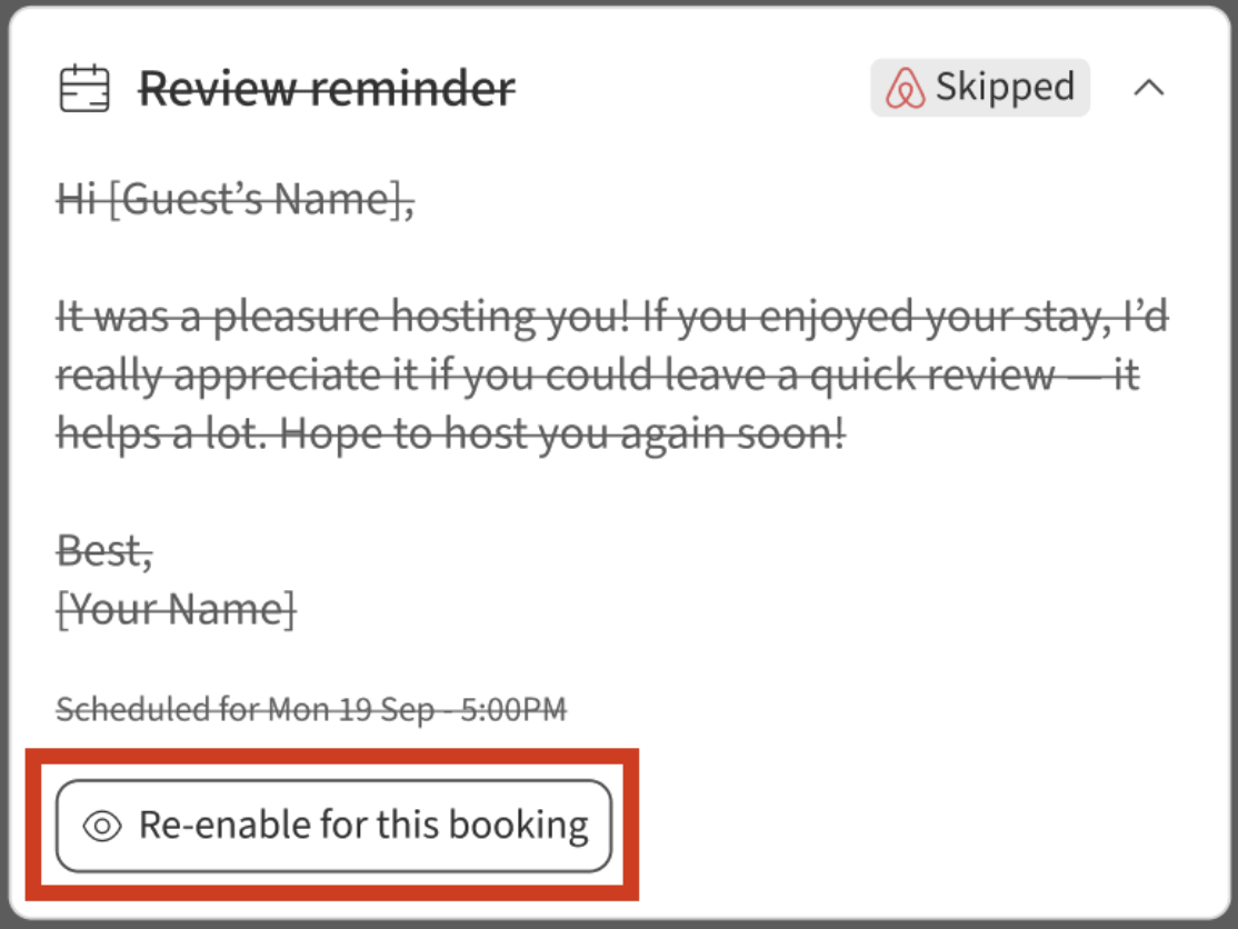 - If you re-enable a skipped message after editing its template, the message will still use the content that was generated when the reservation was first created. Any changes made to the scheduled message templates will only apply to reservations created after the template updates.