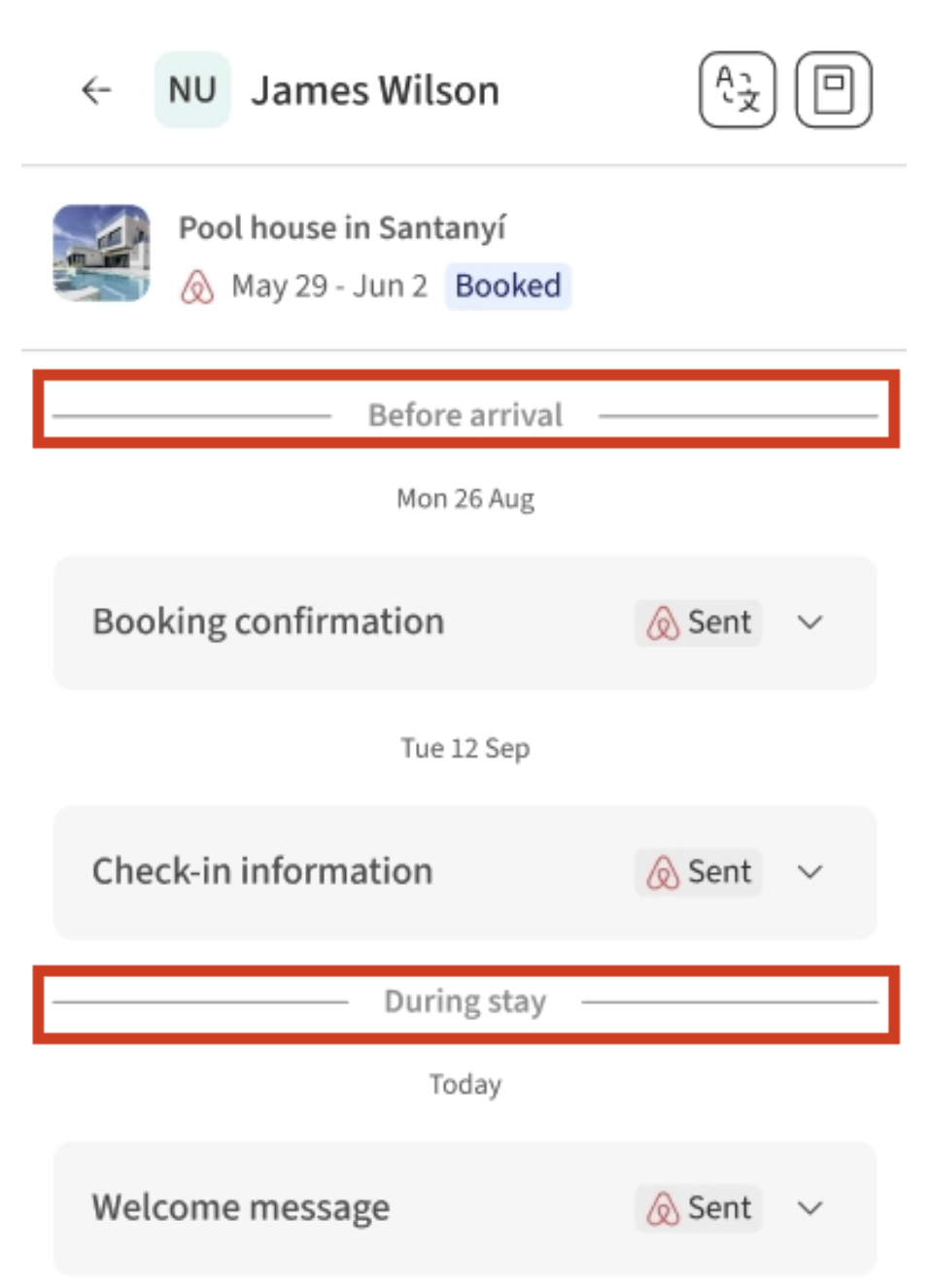 The messaging timeline displays all messages in a single chronological thread, labeled by channel, grouped by booking stage, and clearly showing the sender. This makes it easy to view, skip, and re-enable scheduled messages, giving you full control over communication with your guests.
