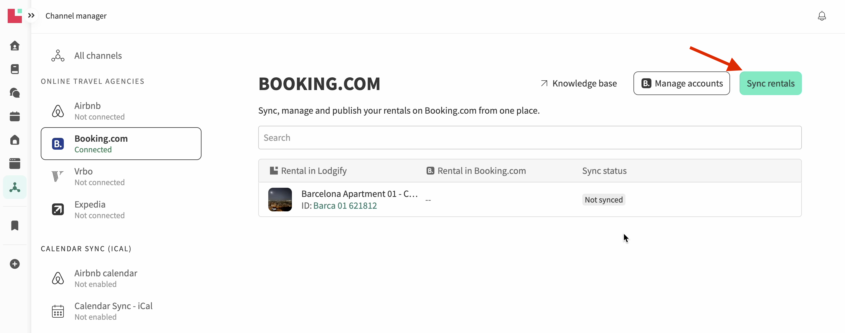 Once the connection is complete, you’ll be able to view the connected Booking.com accounts directly in your Lodgify account. Go to the Channel Manager section and click Manage accounts to see the list of connected accounts.