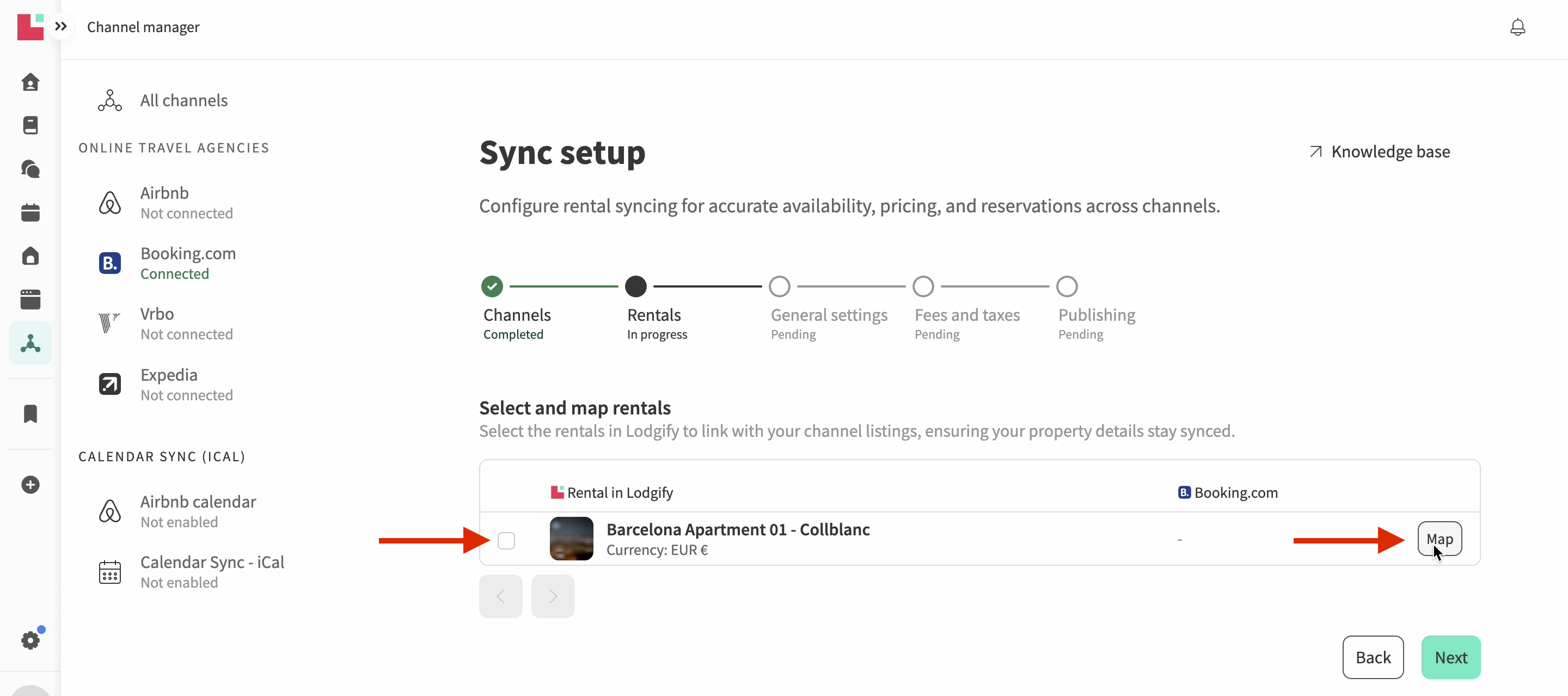 💡 Note: If you are redirected to a form, it means your account does not yet support the beta connection flow. In this case, you’ll need to create your listing on Booking.com manually and then complete the form to sync your rental. - You’ll see a list of your Lodgify rentals. For each rental you want to connect to Booking.com, use the checkbox or click Map.