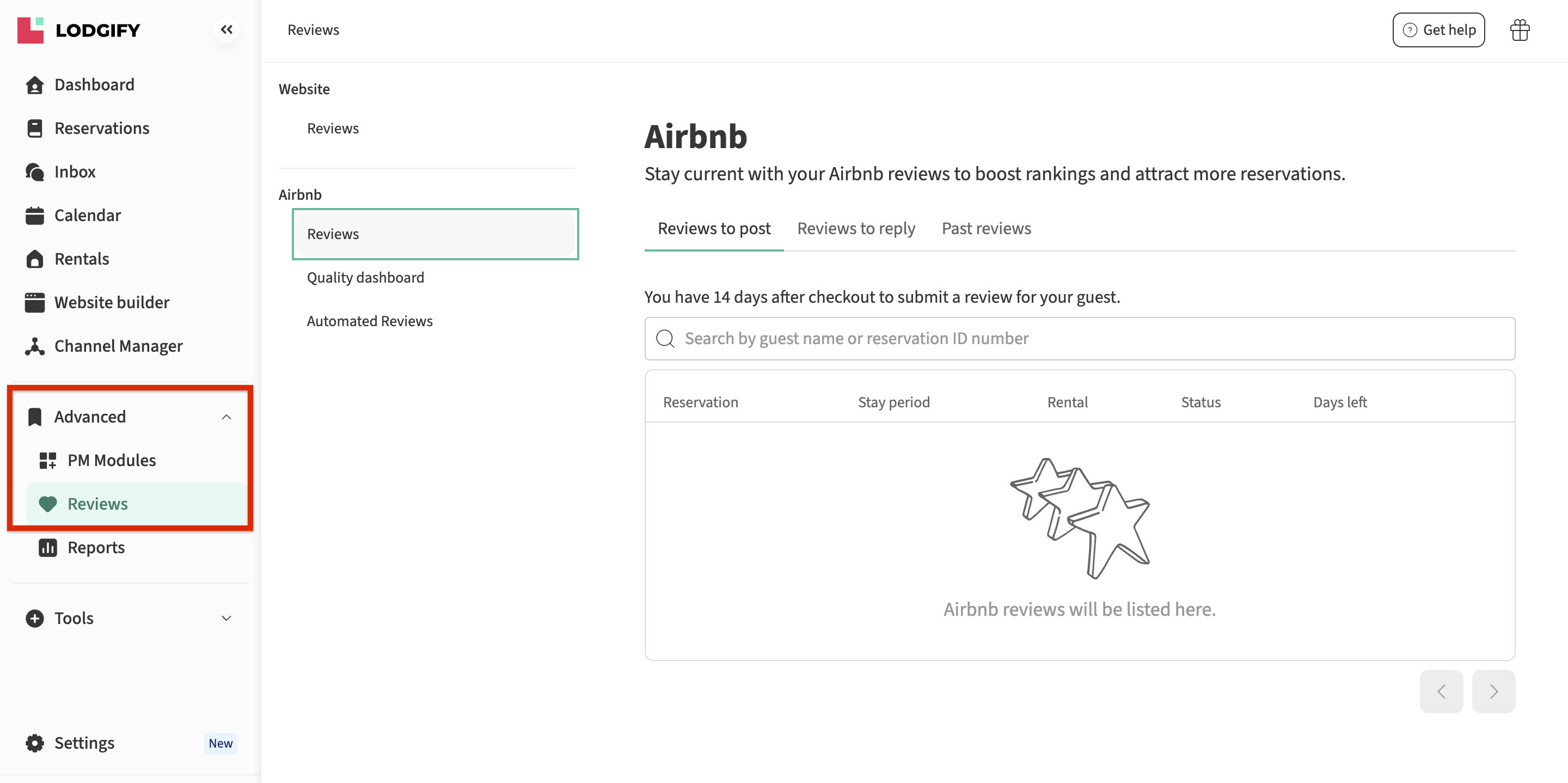 Go to your left-hand menu, select Advanced, and then click on Reviews and Airbnb.