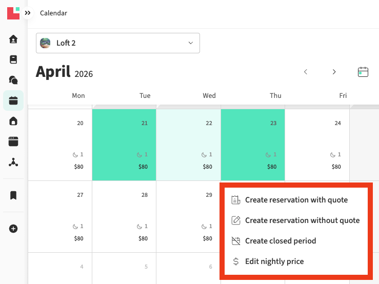 💡 Note: You can also simply click on the calendar on the start date and then click on the end date. A little window will pop up where you can select to create a booking for the selected dates.