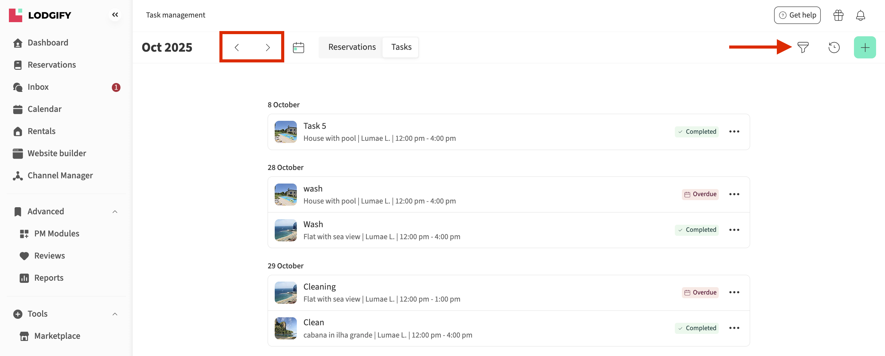 In its respective rental, you need to use the Calendar, which is available on the PM Modules website. If you prefer to search and edit a task according to its status Current, Upcoming or Completed, you should use the Team tasks view.