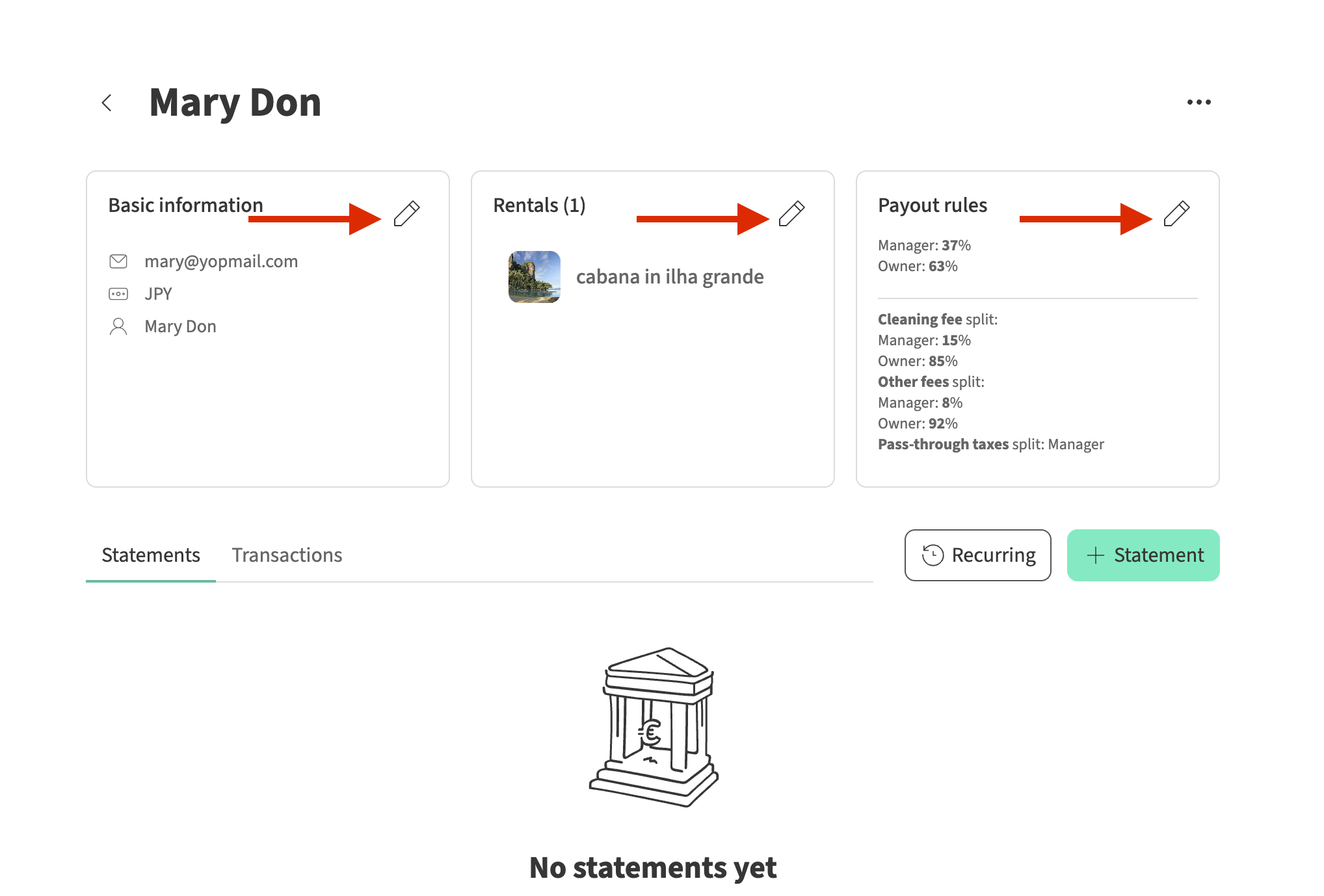 - The payout rules: Define how the reservation earnings are shared between the manager and the owner, including room rate, fees, and taxes. Learn more about payout rules here.