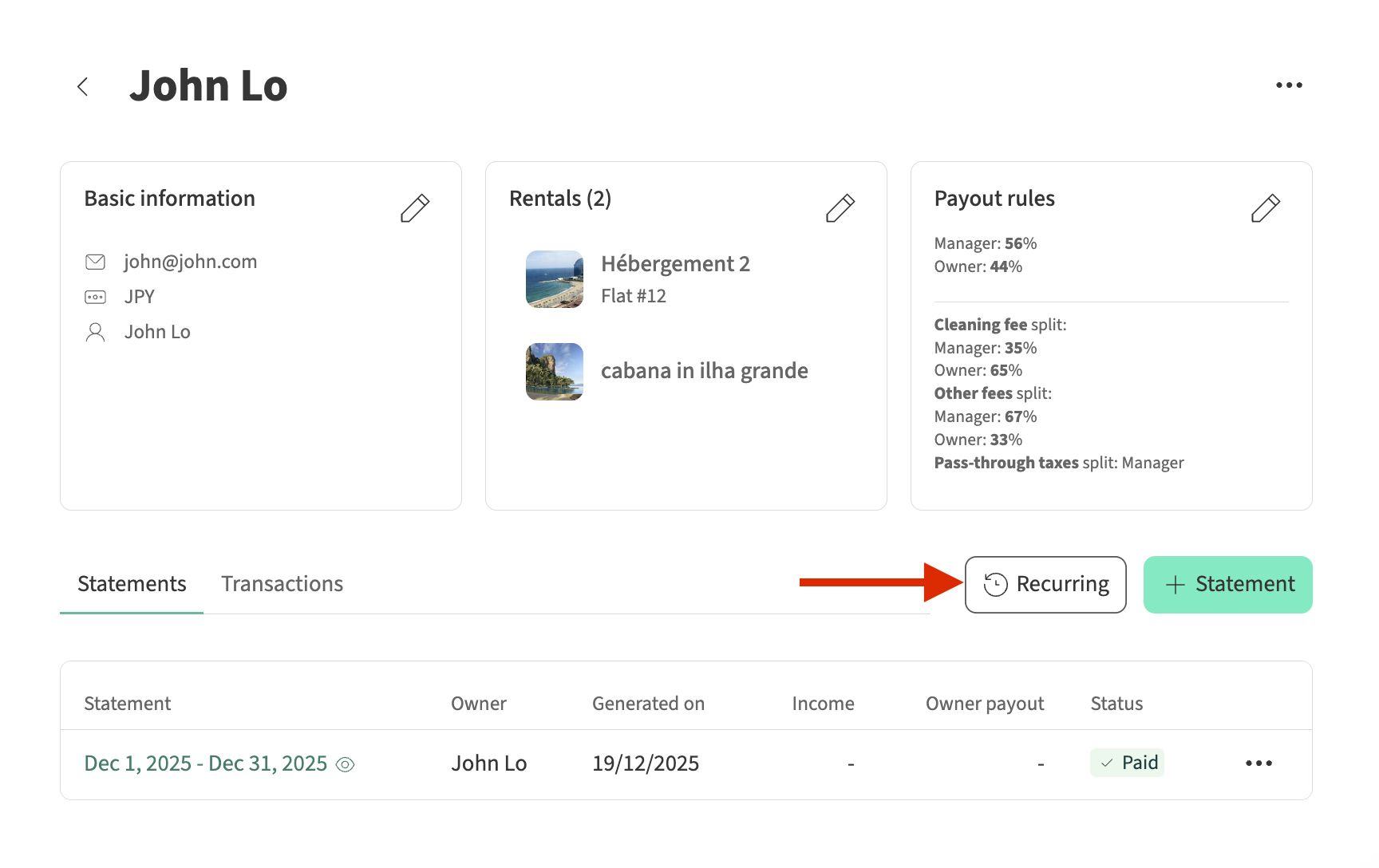 - Click the owner whose recurring statement you want to manage, then select Recurring.