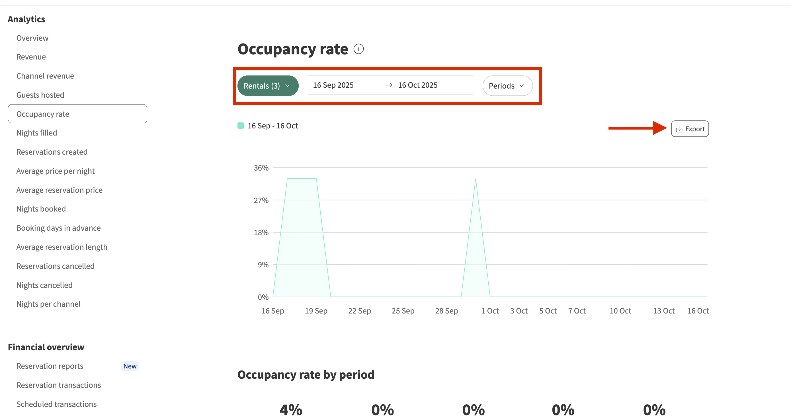 To download a report, choose your rentals, dates, and periods, then click Export: