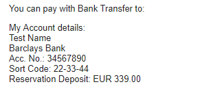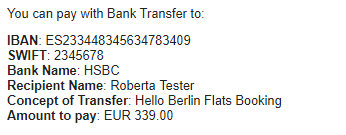 | {{BankTransferConcept}} | The subject of the bank transfer. Example: Hello Berlin Flats Booking |