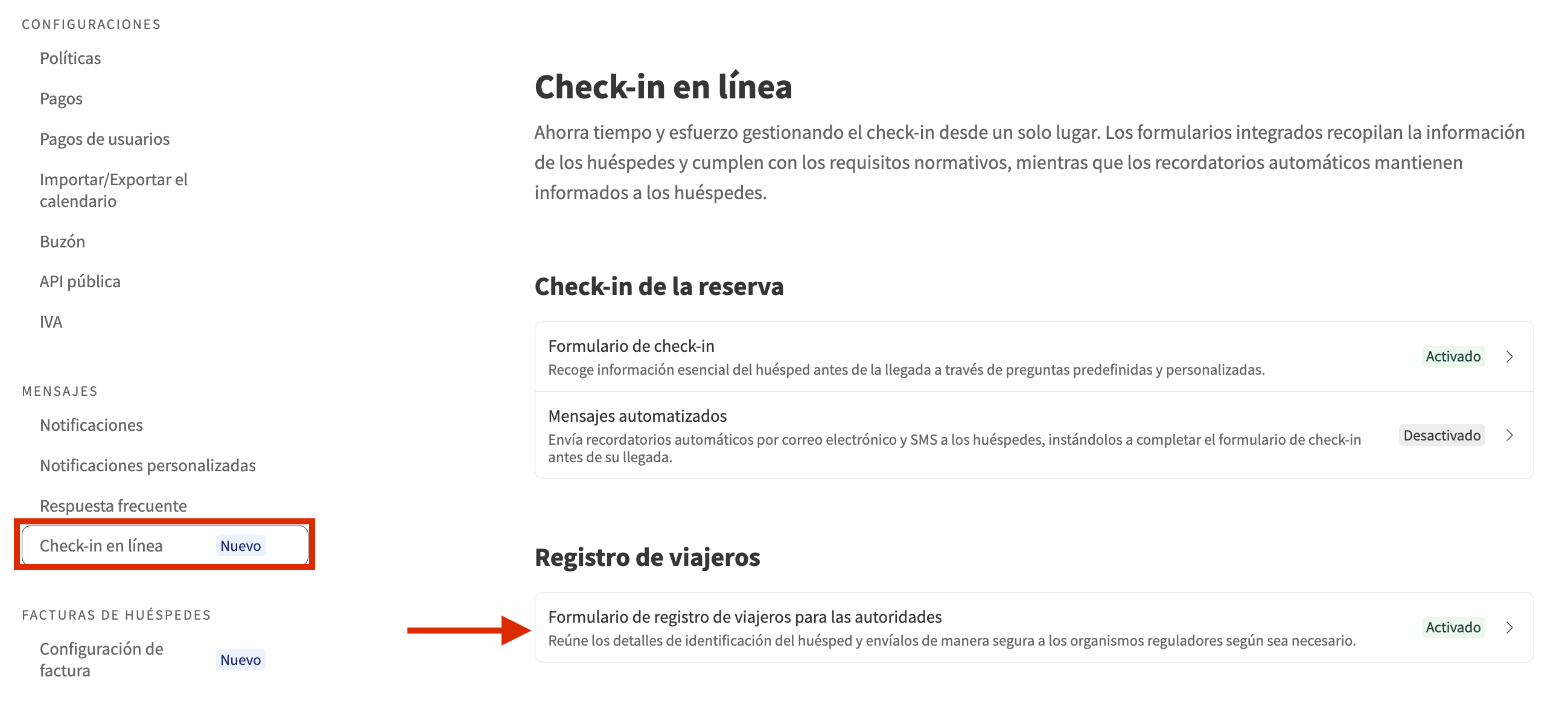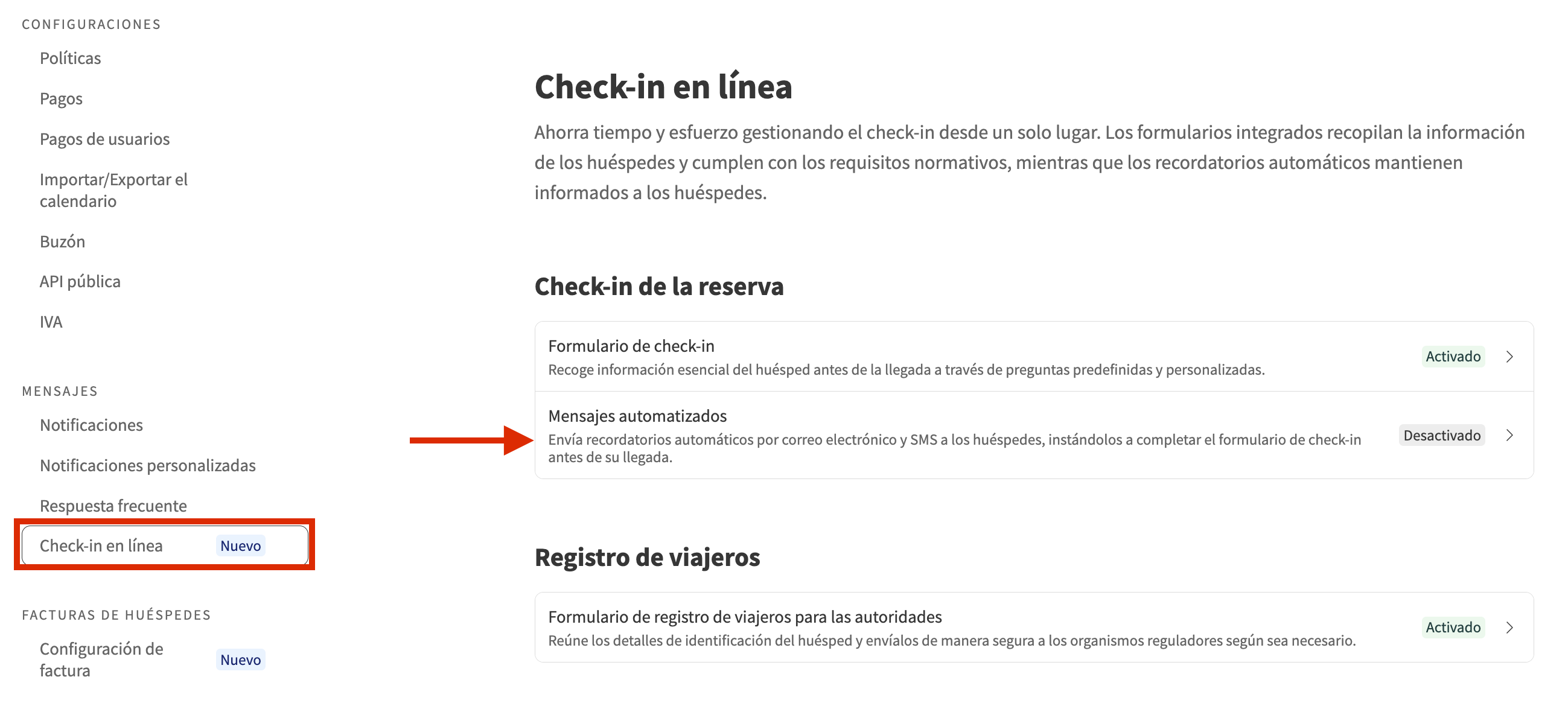 Si el formulario de check-in de la reserva está activado, el formulario de registro de viajeros se enviará junto con él. Al activar el formulario de check-in, puedes elegir activar los Mensajes automáticos. Si lo haces, el formulario de registro de viajeros se enviará automáticamente al mismo tiempo que el formulario de check-in, siguiendo las reglas configuradas en tus ajustes de Mensajes automáticos.