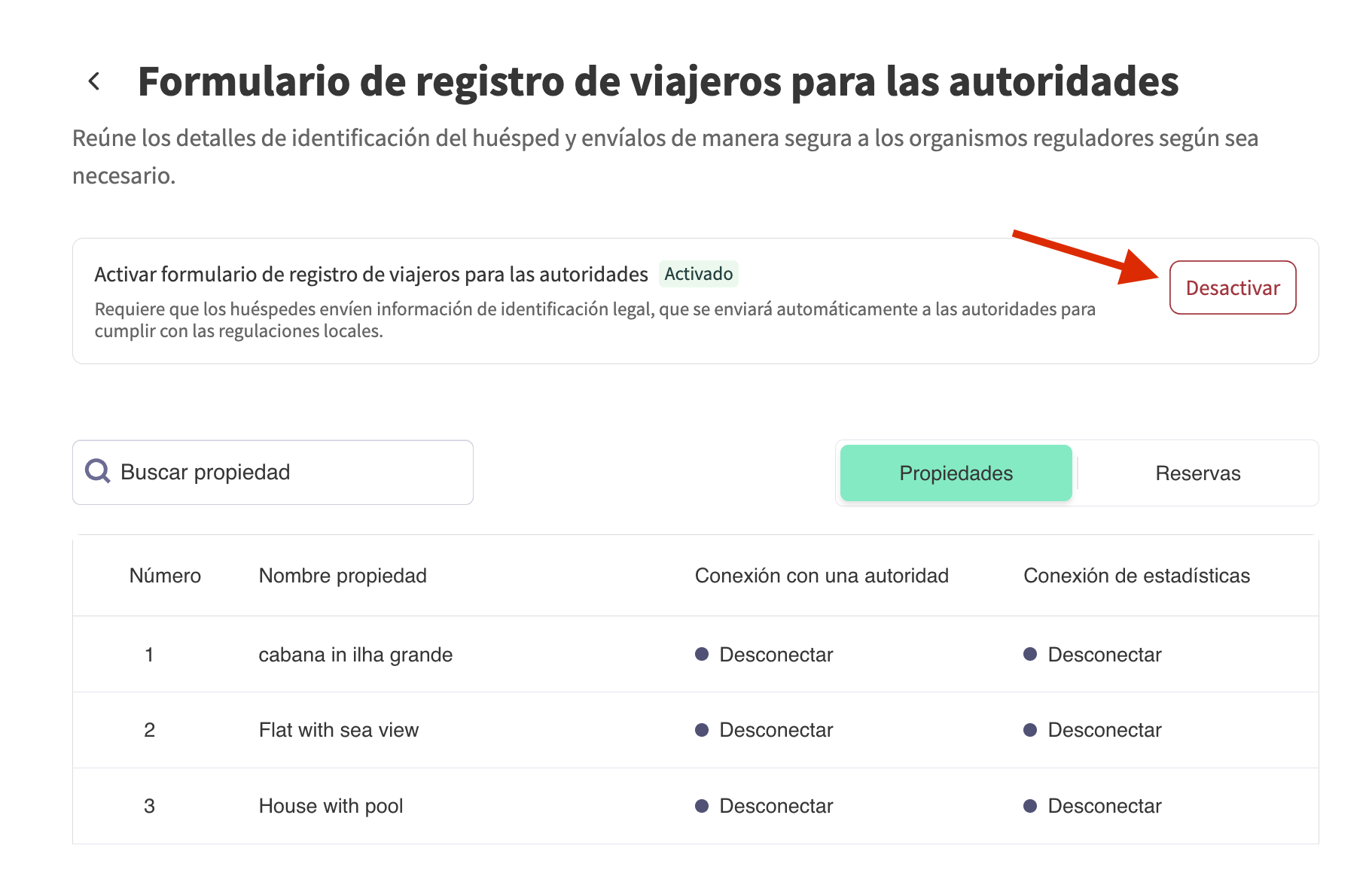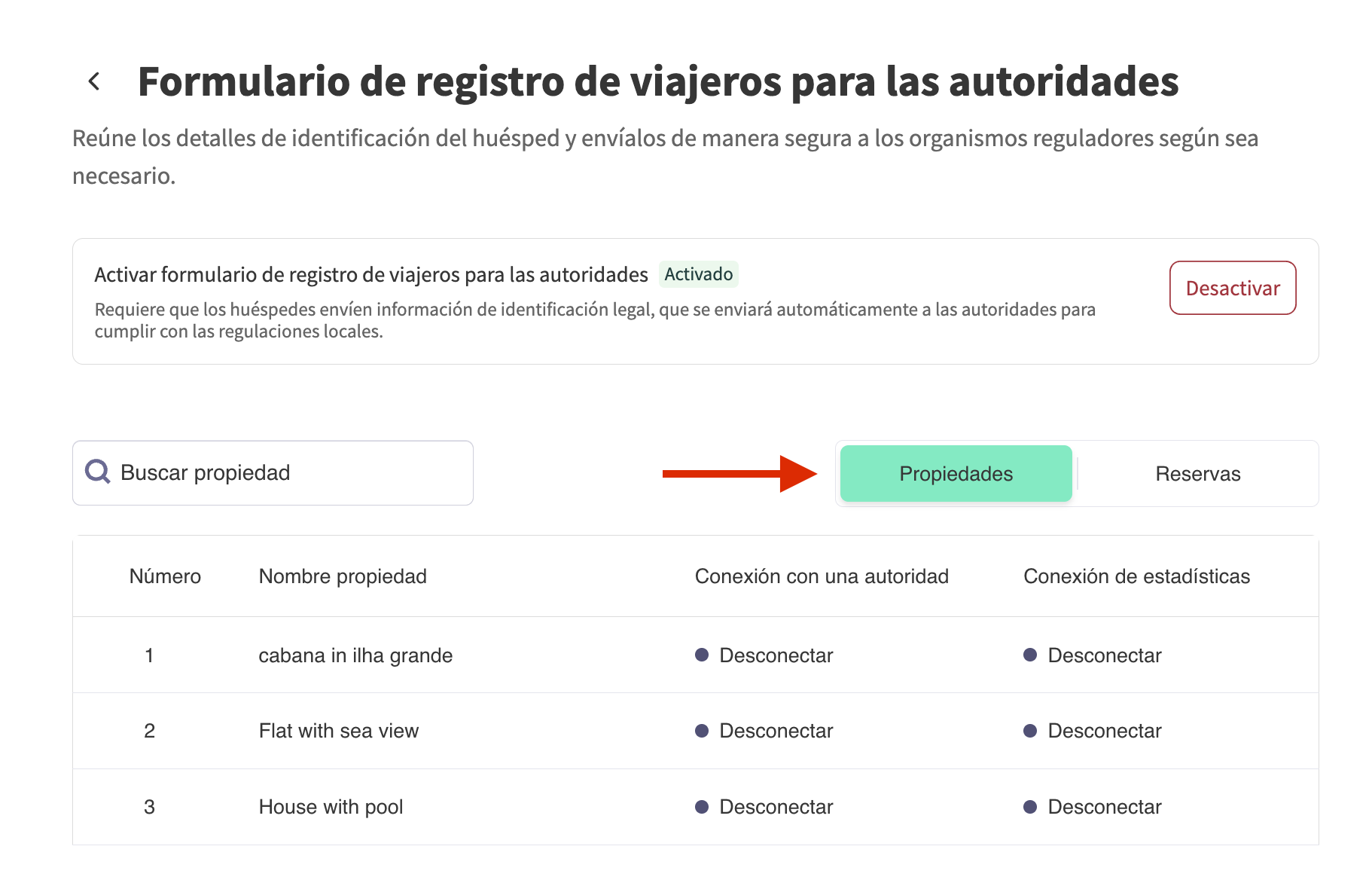 Si acabas de activar el formulario de registro de viajeros, has añadido más alojamientos o has desconectado y vuelto a conectar tu cuenta, tendrás que establecer la conexión entre tus propiedades y la autoridad local. Para hacerlo, sigue estos pasos: