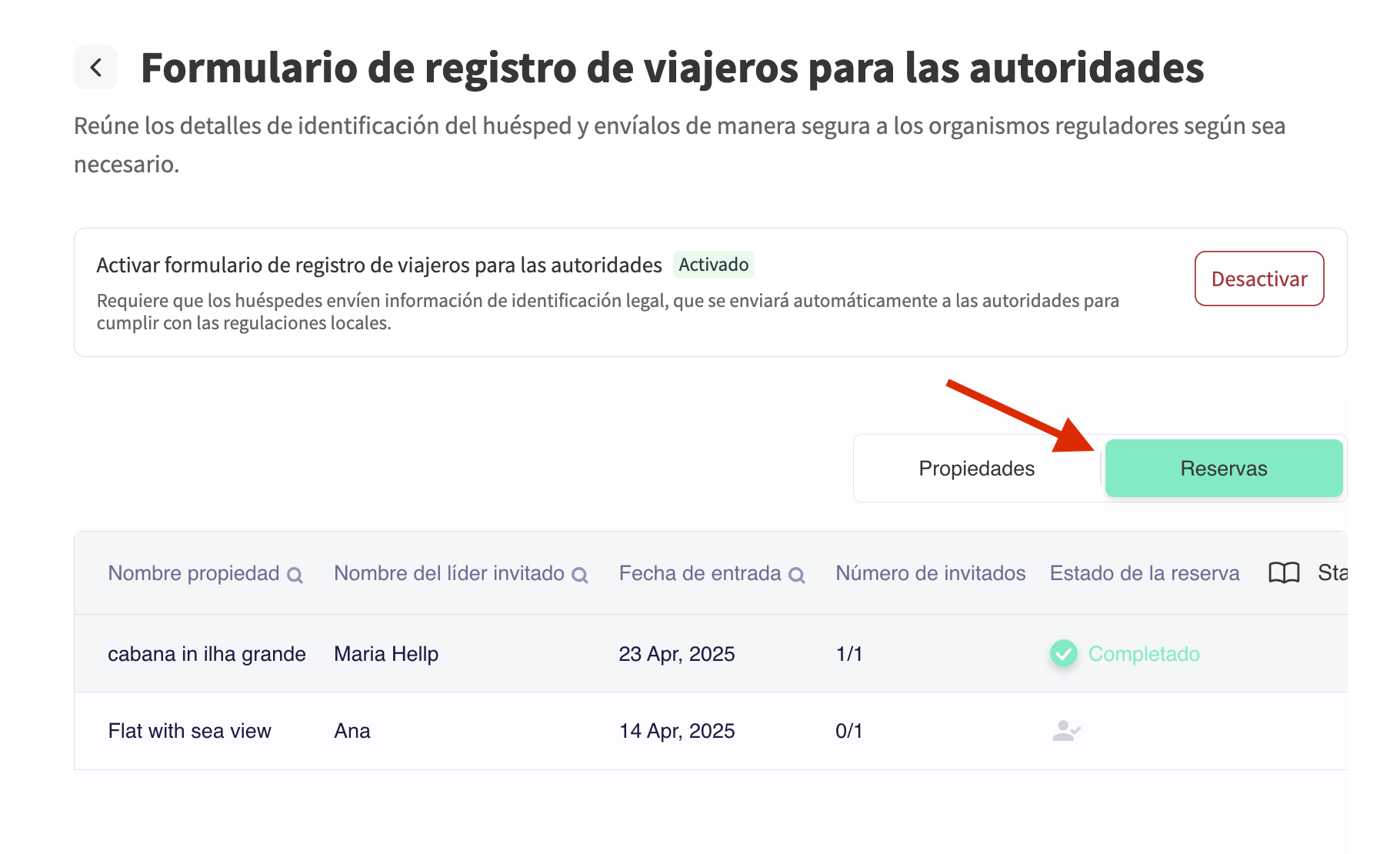- En la sección de Registro de viajeros, la información enviada aparecerá en la pestaña Reservas.