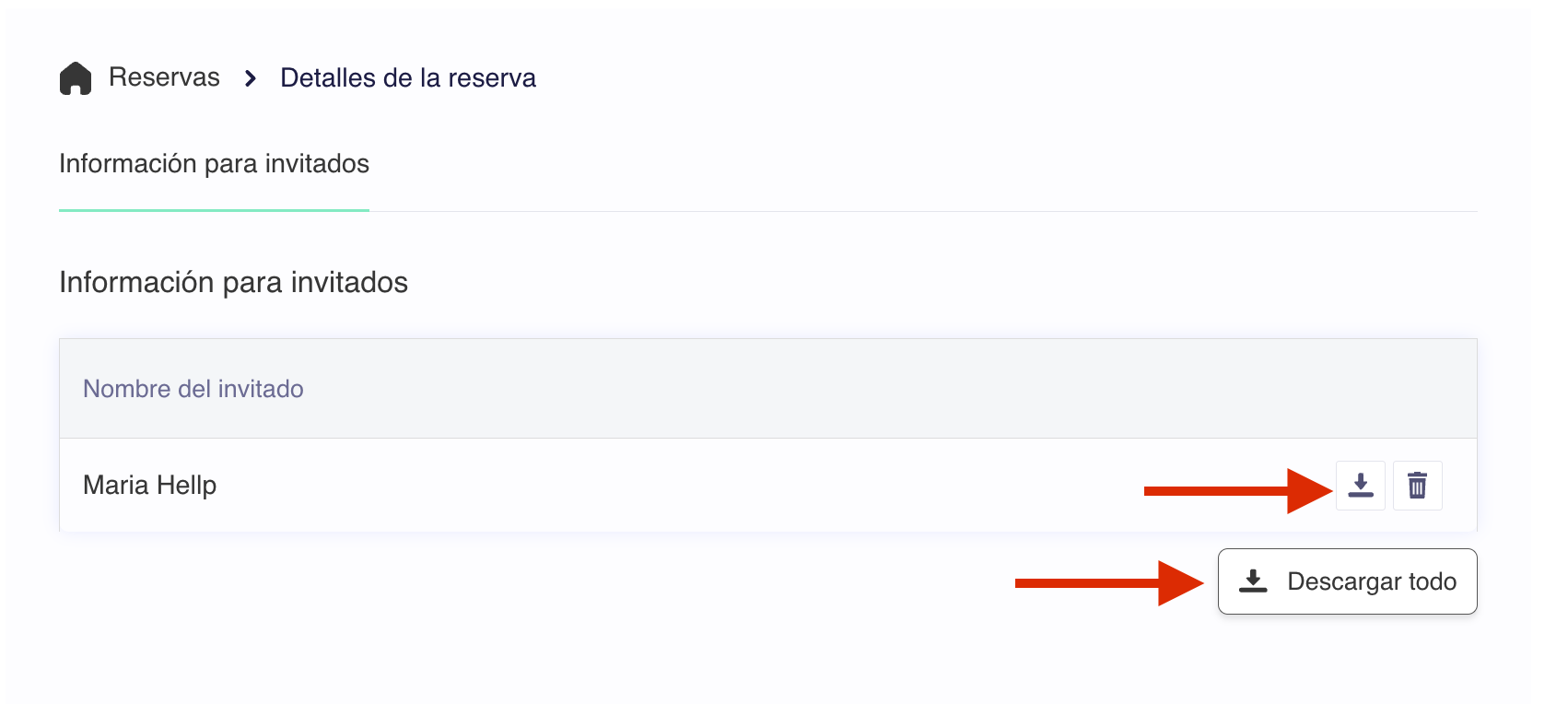 - Puedes elegir descargar la información enviada por un huésped específico o por todos los huéspedes asociados a esa reserva.