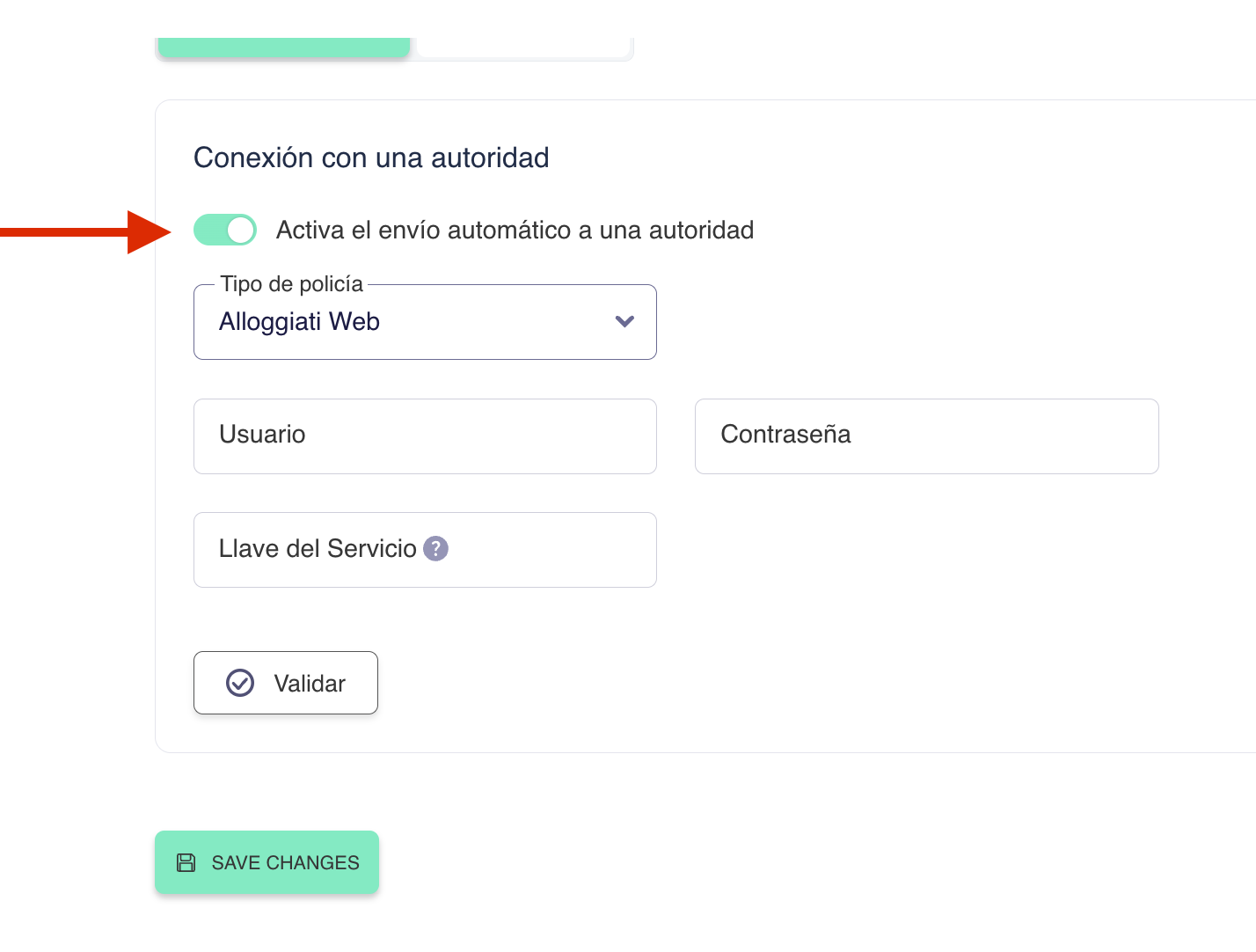 - Se generarán credenciales específicas al activar la funcionalidad. Después de la activación, el sistema sincronizará todos los alojamientos y reservas con fecha de check-in a partir de la fecha de activación.