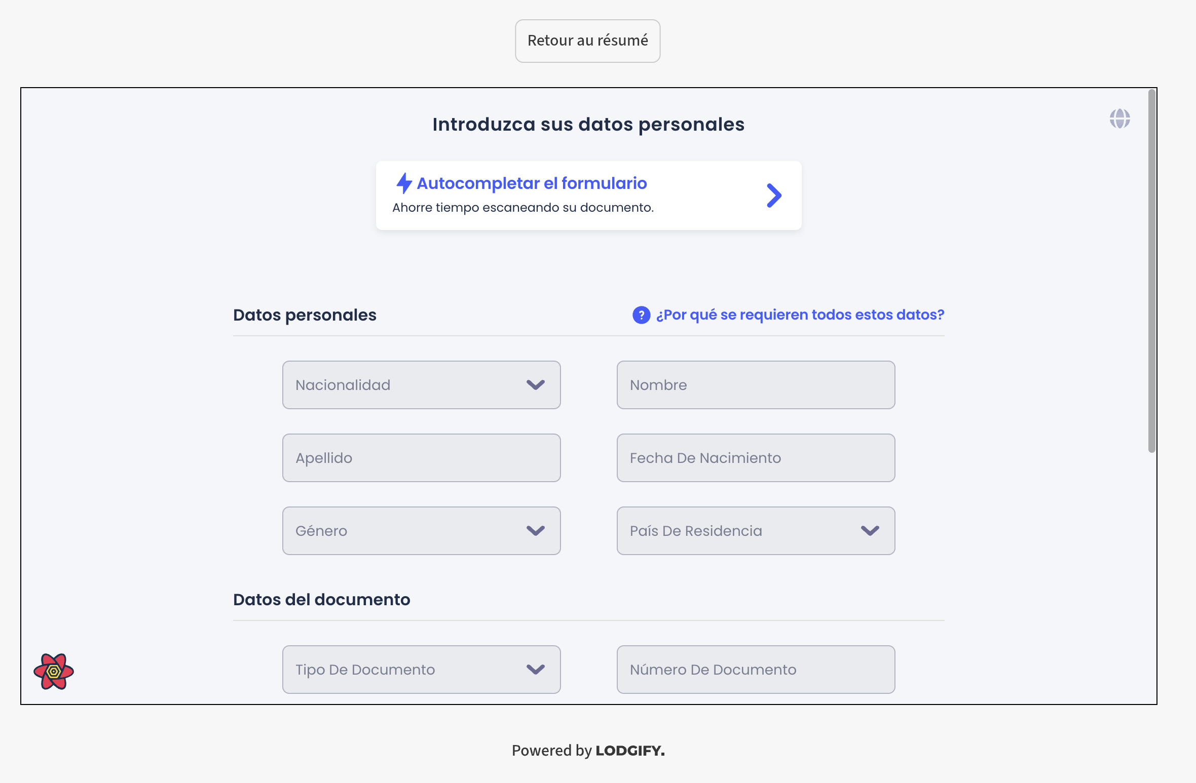 - Cuando el Huésped abra el enlace del formulario de registro de viajeros, verá la página donde puede introducir sus datos personales: