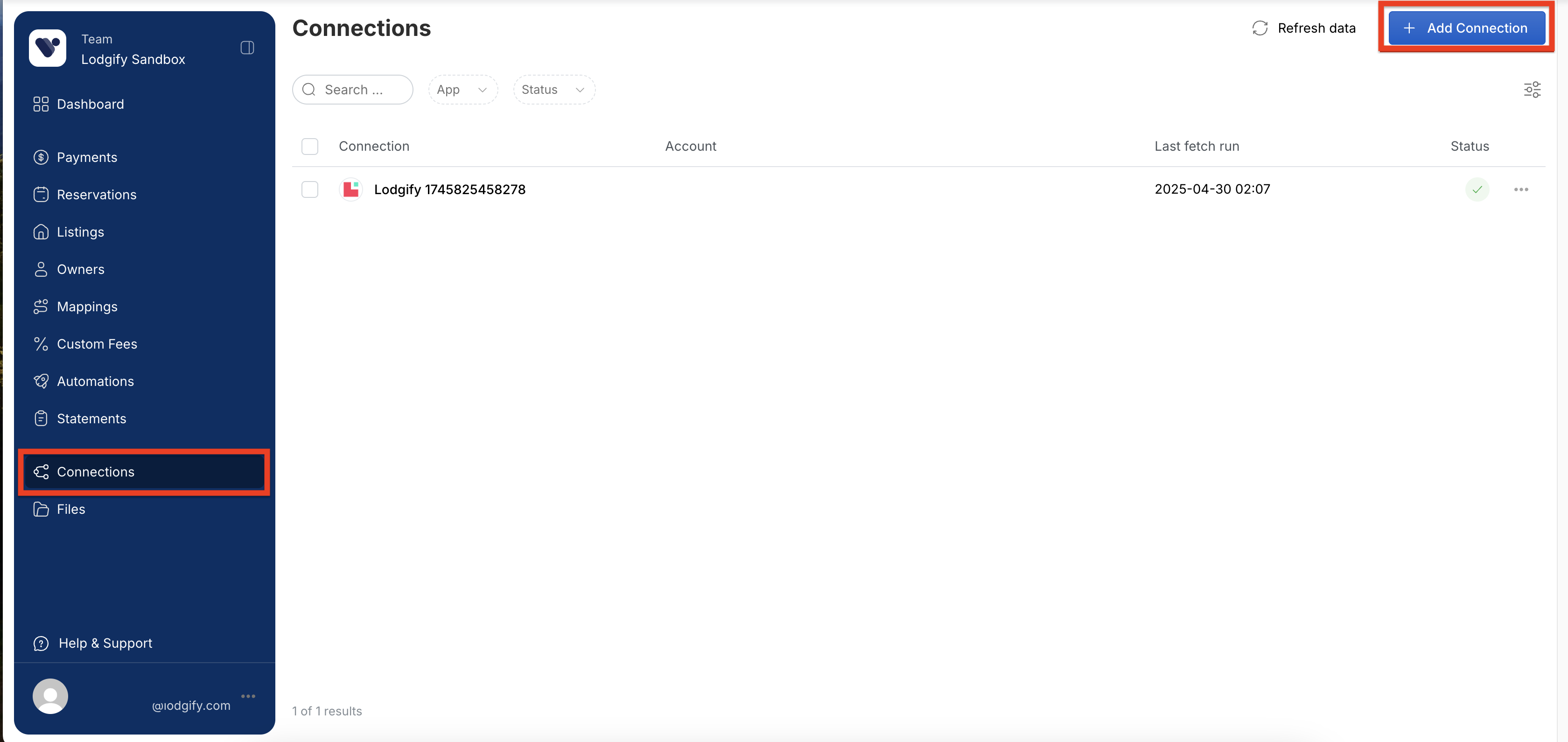 - Inicia sesión en tu cuenta de VRPlatform, ve a la sección Connections y haz clic en Add Connection: