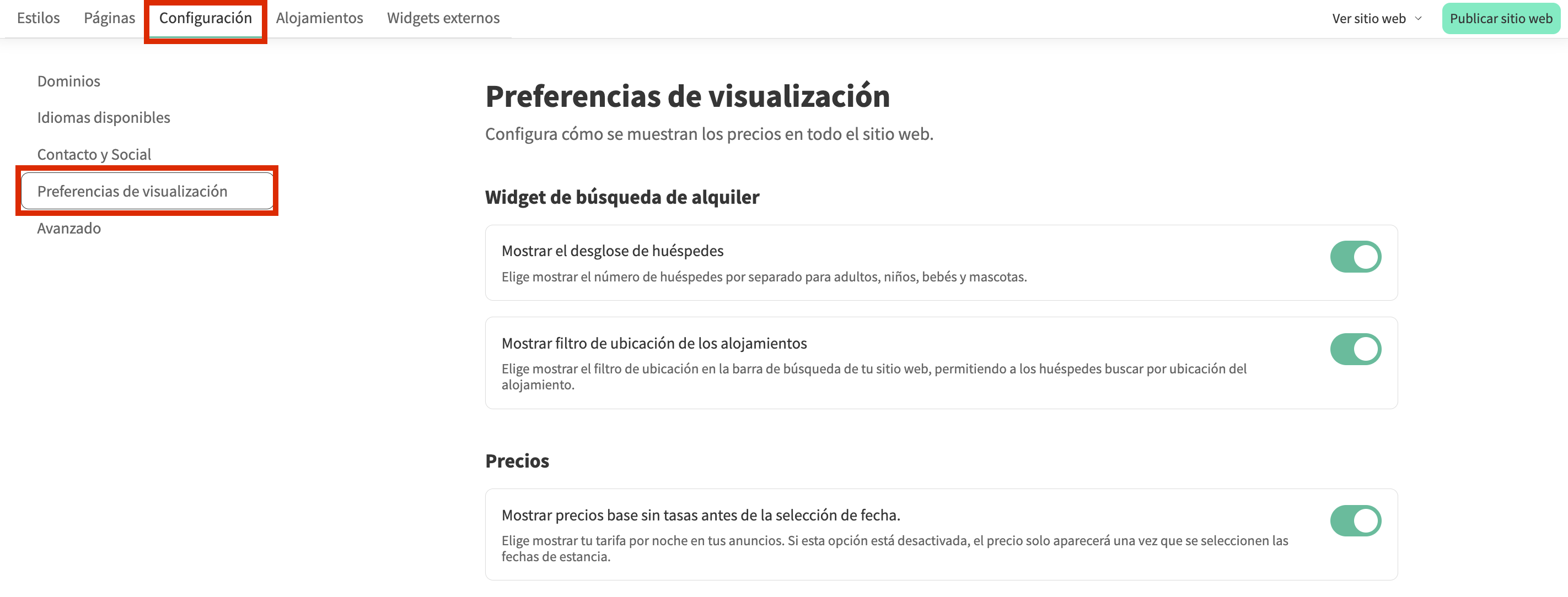Gestiona la visualización de la información en tu sitio web, incluido el widget de búsqueda de alojamiento y la visualización del precio.