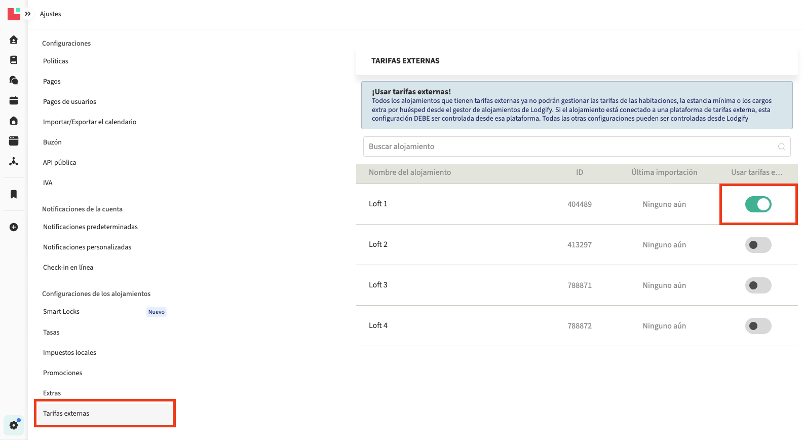 Si el botón de estado está activado para el alojamiento, significa que se están utilizando tarifas externas.