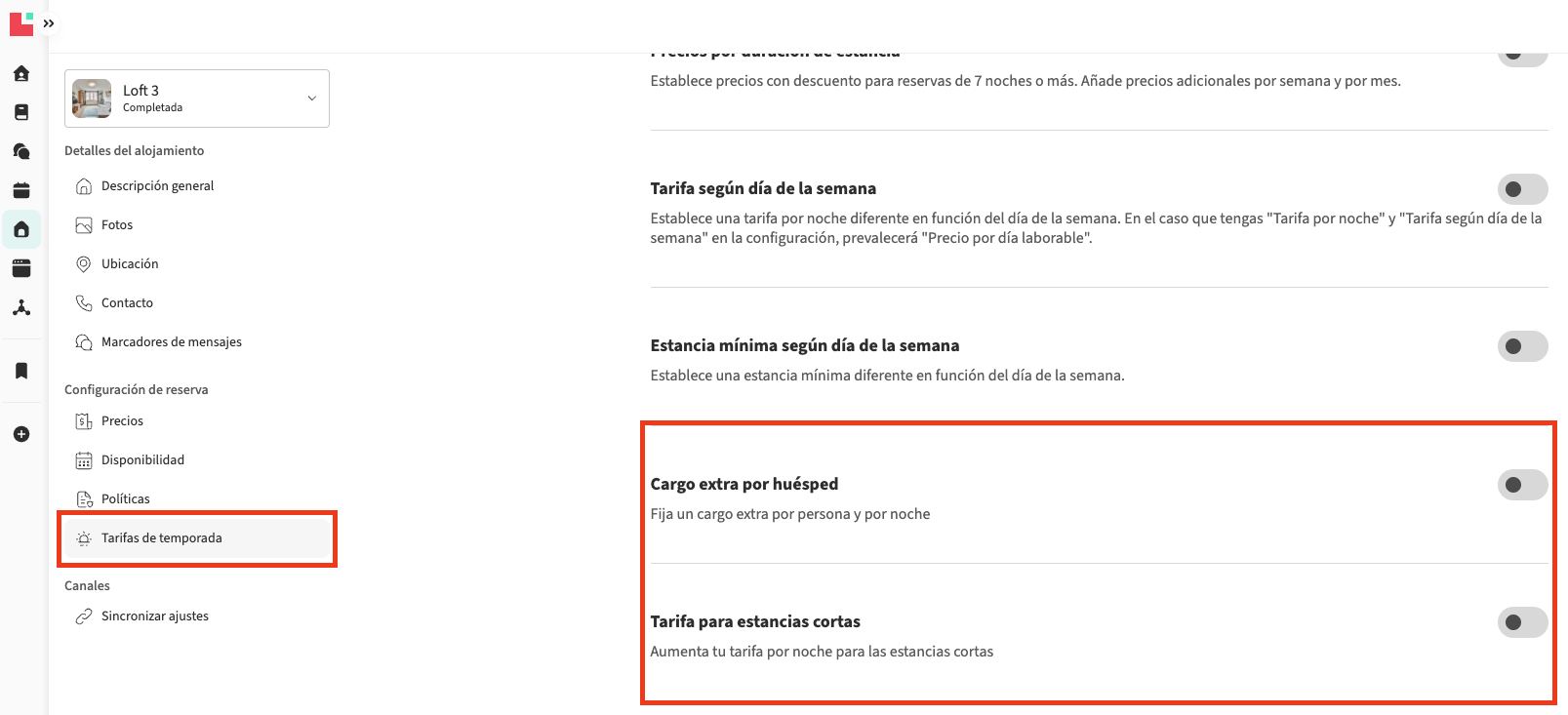 - Precio para estancia corta — se añade al precio por noche cuando el número de noches es igual o inferior al mínimo que hayas definido.
