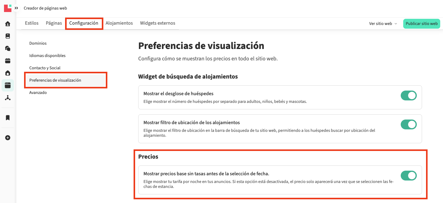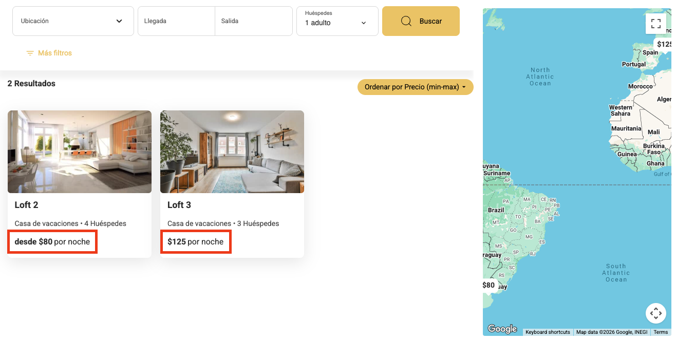 - El precio más bajo asociado a la estancia mínima más baja será el precio que se muestre en tu sitio web.