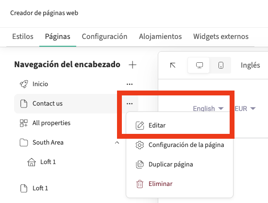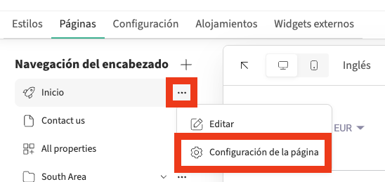 Puedes cambiar los títulos de las páginas en la sección Páginas de tu Creador web. Haz clic en los Tres puntos junto a la página y selecciona Configuración de la página.