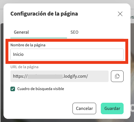 En el pop-up, ajusta el título de la página en el campo Nombre de la página.