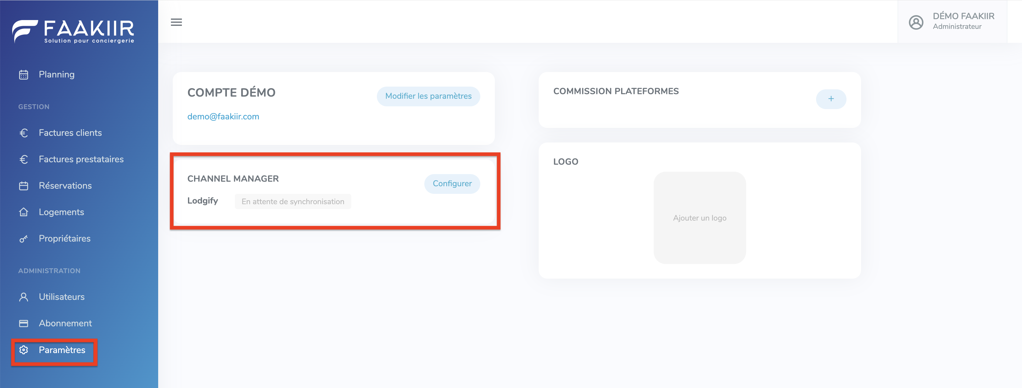 - En el menú de la izquierda, haz clic en Paramètres, busca la sección Channel Manager y selecciona Configurer: