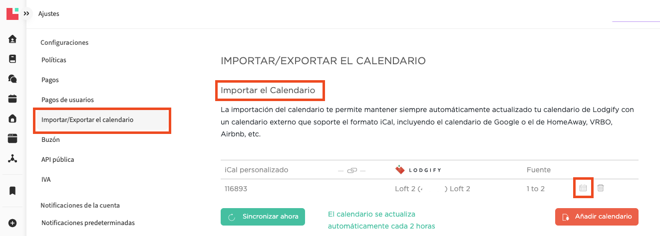 En la sección de Importar, busca la conexión iCal en cuestión y haz clic en el ícono de calendario situado a su lado.