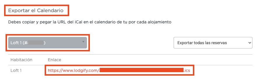 Haz clic en el enlace iCal rojo para descargar el archivo .ics de Lodgify.