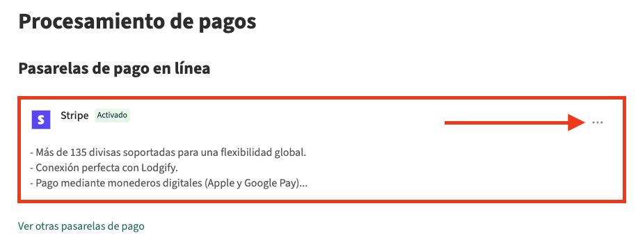 - En Pasarelas de pago en línea, encuentra Stripe.