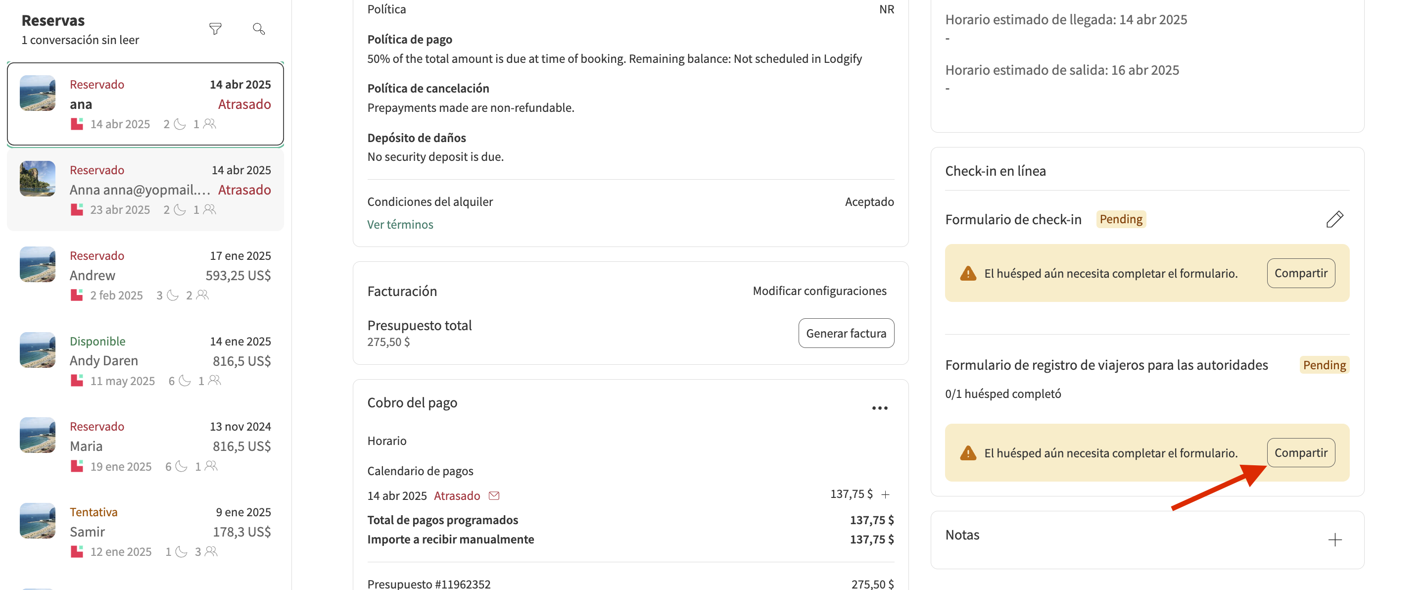💡 Nota: Los datos de los huéspedes se envían automáticamente a las autoridades el día del check-in, aproximadamente a las 19:00 UTC. Si los huéspedes se registran después de esta hora, deberás enviar los datos manualmente desde la reserva.
