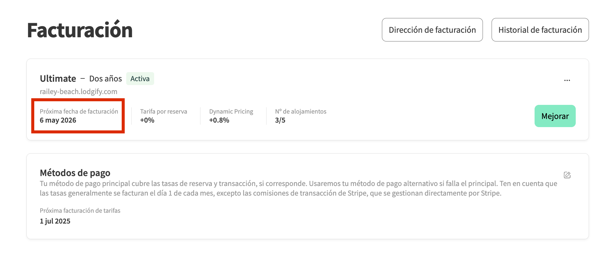 Puedes consultar tu próxima fecha de renovación en cualquier momento desde la sección Facturación de tu cuenta: