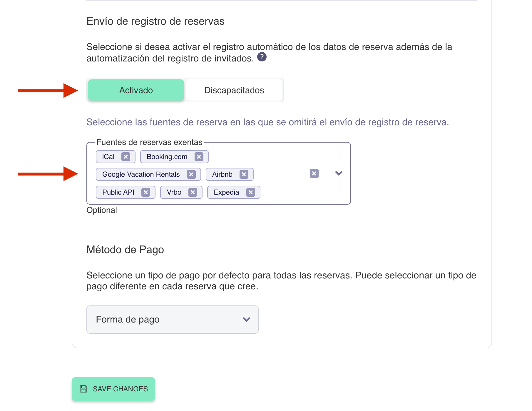 - Una vez conectado, podrás activar el Envío de registro de reservas.