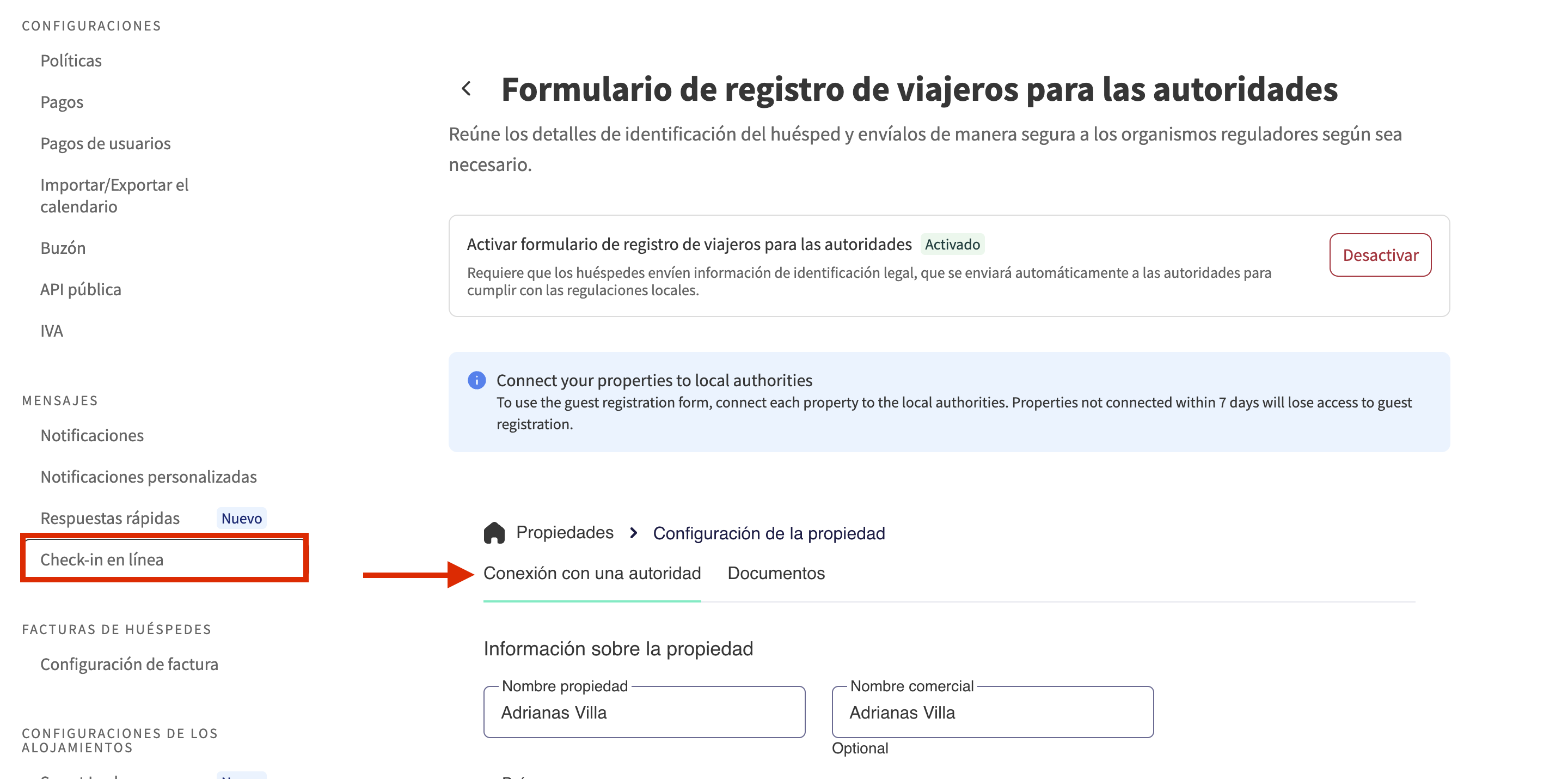 - Haz clic en Formulario de registro de viajeros para las autoridades, selecciona un alojamiento y activa la Conexión con una autoridad si aún no lo has hecho.