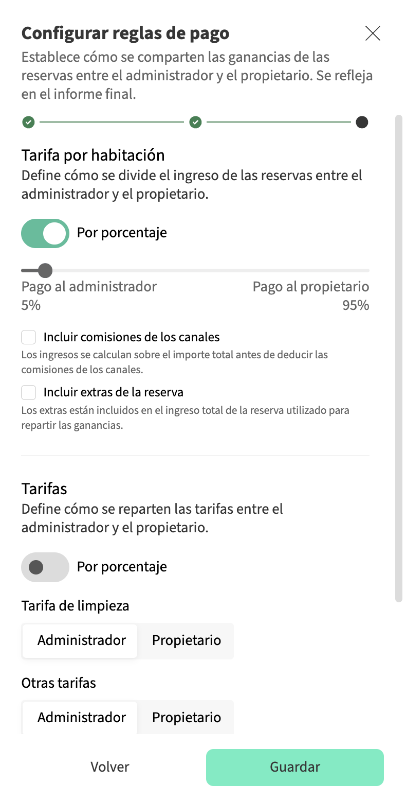 Tarifas: Si toda la comisión va al propietario, simplemente selecciona el propietario y deja el interruptor apagado. Si deseas dividir la comisión, activa el interruptor de porcentaje y establece los pagos para el gestor y el propietario. Puedes aplicar configuraciones diferentes para las tarifas de limpieza y otros cargos.