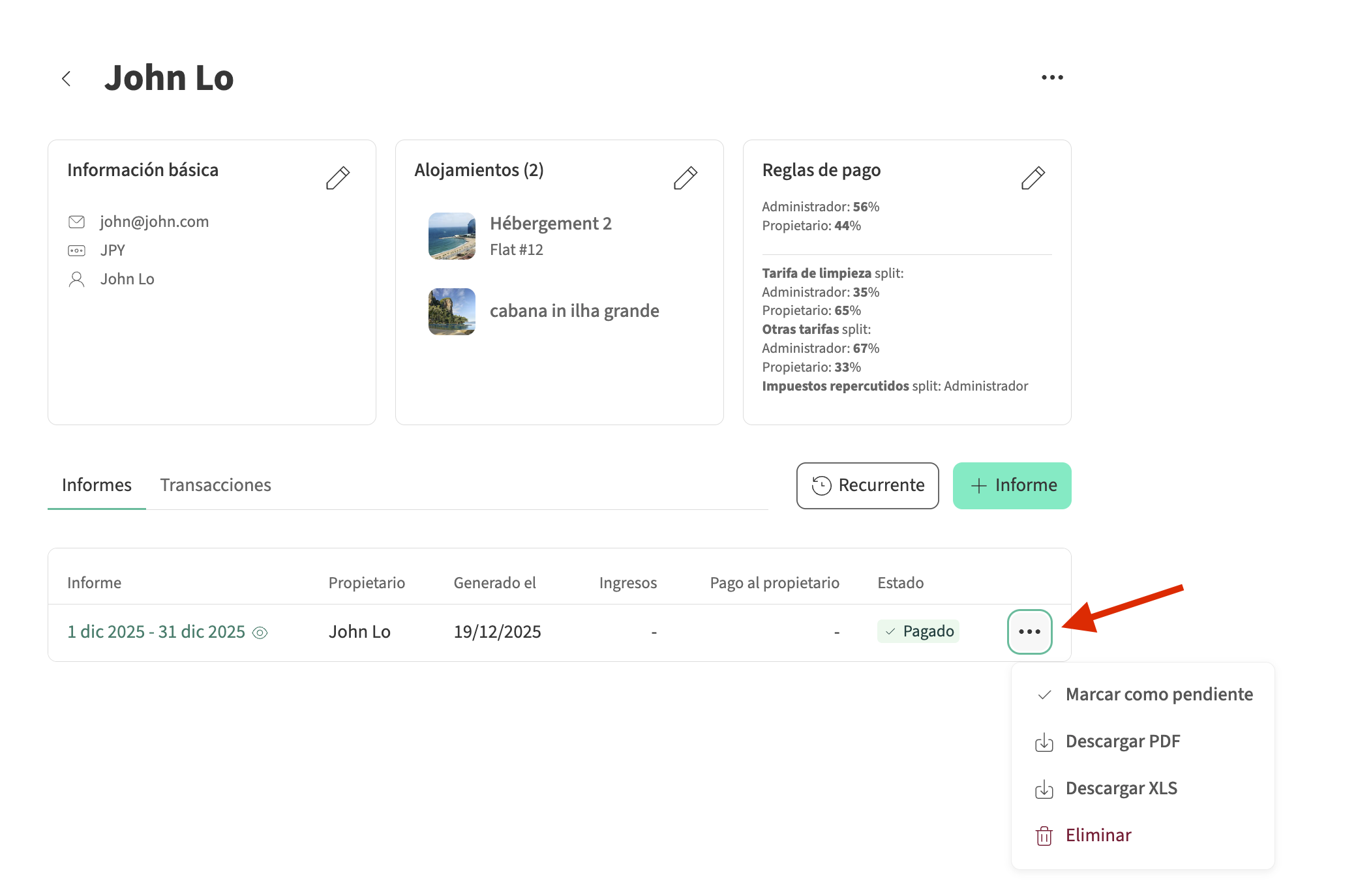 - Haz clic en el propietario asociado, luego selecciona los tres puntos a la derecha del informe que deseas marcar como pagado y haz clic en Marcar como pagado.