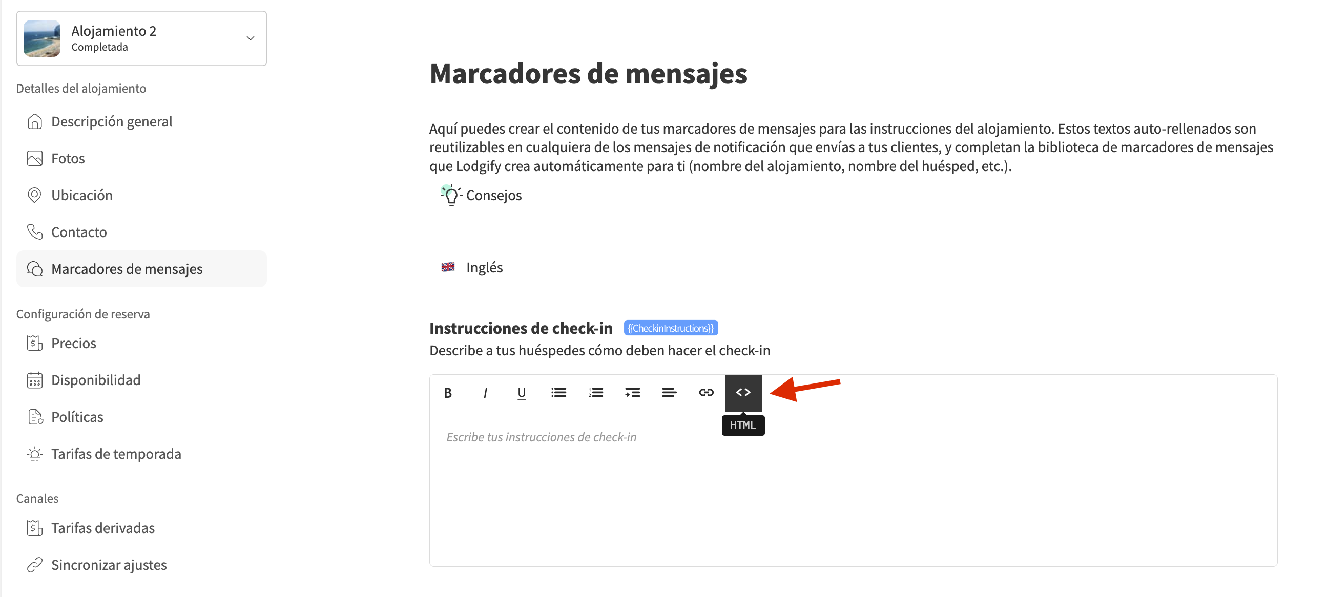 💡 Nota: Para consultar la lista completa de marcadores de mensajes disponibles y sus detalles, incluidos los marcadores predefinidos de Lodgify, consulta este artículo.