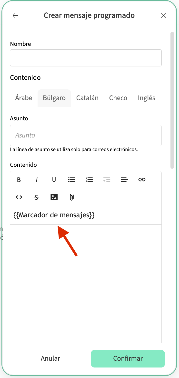 Una vez estés en el editor de texto de la respuesta rápida o del mensaje programado, puedes hacer clic en {{Marcador de mensajes}} y seleccionar el marcador correspondiente: