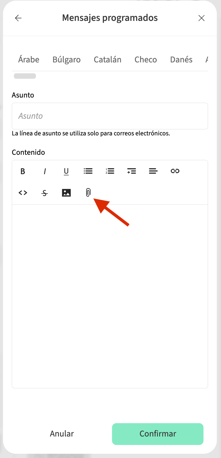 - Una vez en el editor de texto del mensaje, haz clic en el icono de adjuntar. Se abrirá una ventana emergente donde podrás arrastrar y soltar o subir archivos desde tu ordenador.