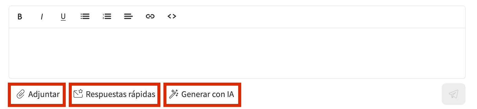 Desde tu cuenta de Lodgify, abre un nuevo mensaje y utiliza el editor de texto en la parte inferior del hilo de mensajes. Luego puedes redactar tu mensaje en el campo de texto, hacer clic en Generar con IA, o seleccionar una de tus Respuestas rápidas en el menú desplegable. También puedes adjuntar imágenes o archivos a tus mensajes.