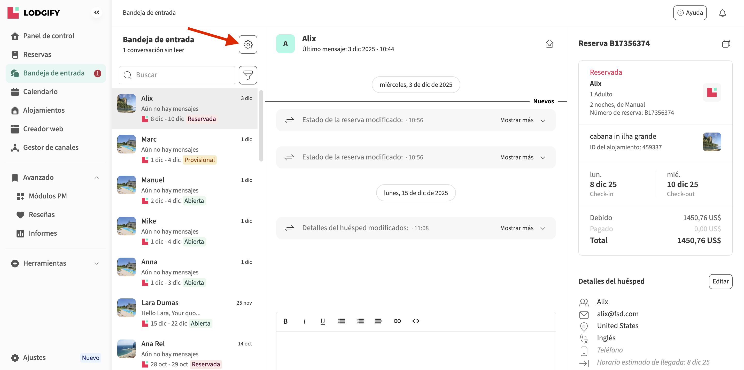 - Información sobre cambios relacionados con las reservas o los detalles del huésped.