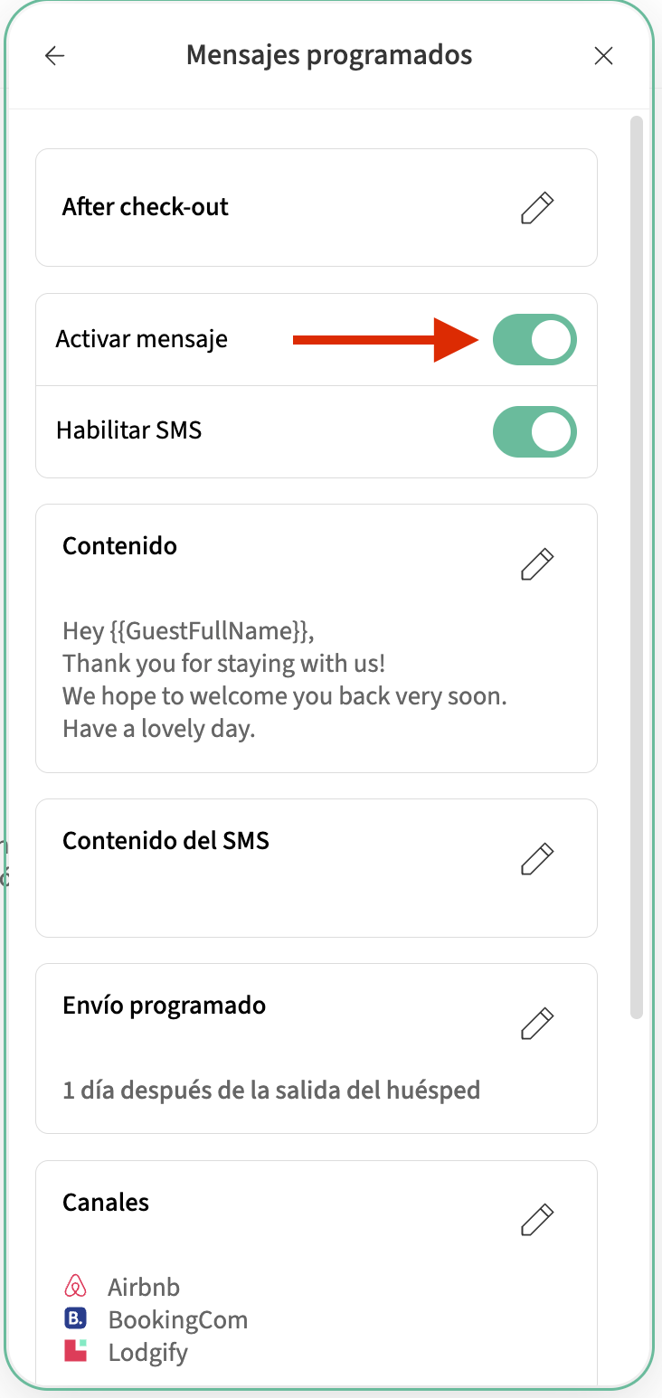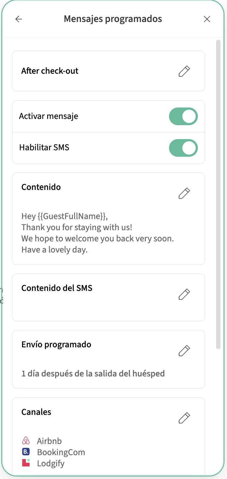 Estos mensajes programados están destinados a tus Huéspedes. Si quieres enviar mensajes automáticos a tu contacto del alojamiento y/o contacto de la cuenta, sigue las instrucciones proporcionadas en este artículo.