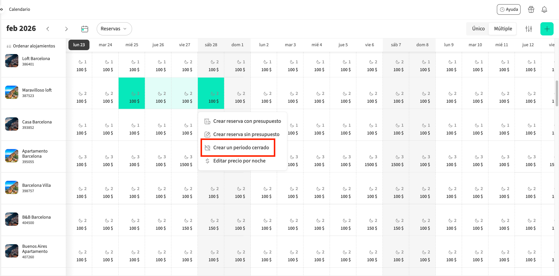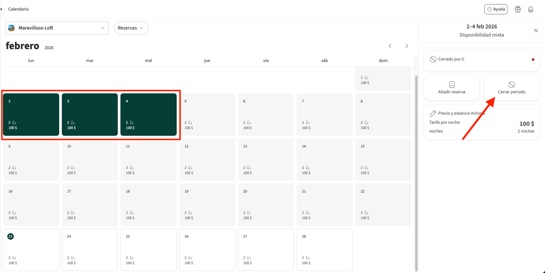 - Una vez que hayas seleccionado tu alojamiento, haz clic en la fecha o en el rango de fechas que quieres cerrar. En el lado derecho, selecciona Cerrar periodo.