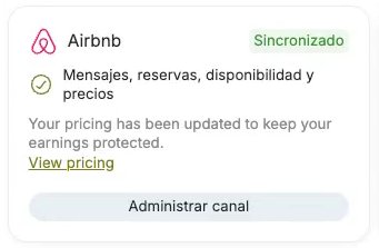 Después de completar la conexión, tu alojamiento aparecerá como Synced y podrás hacer clic en Manage Channel para revisar y editar la configuración del canal de Airbnb.