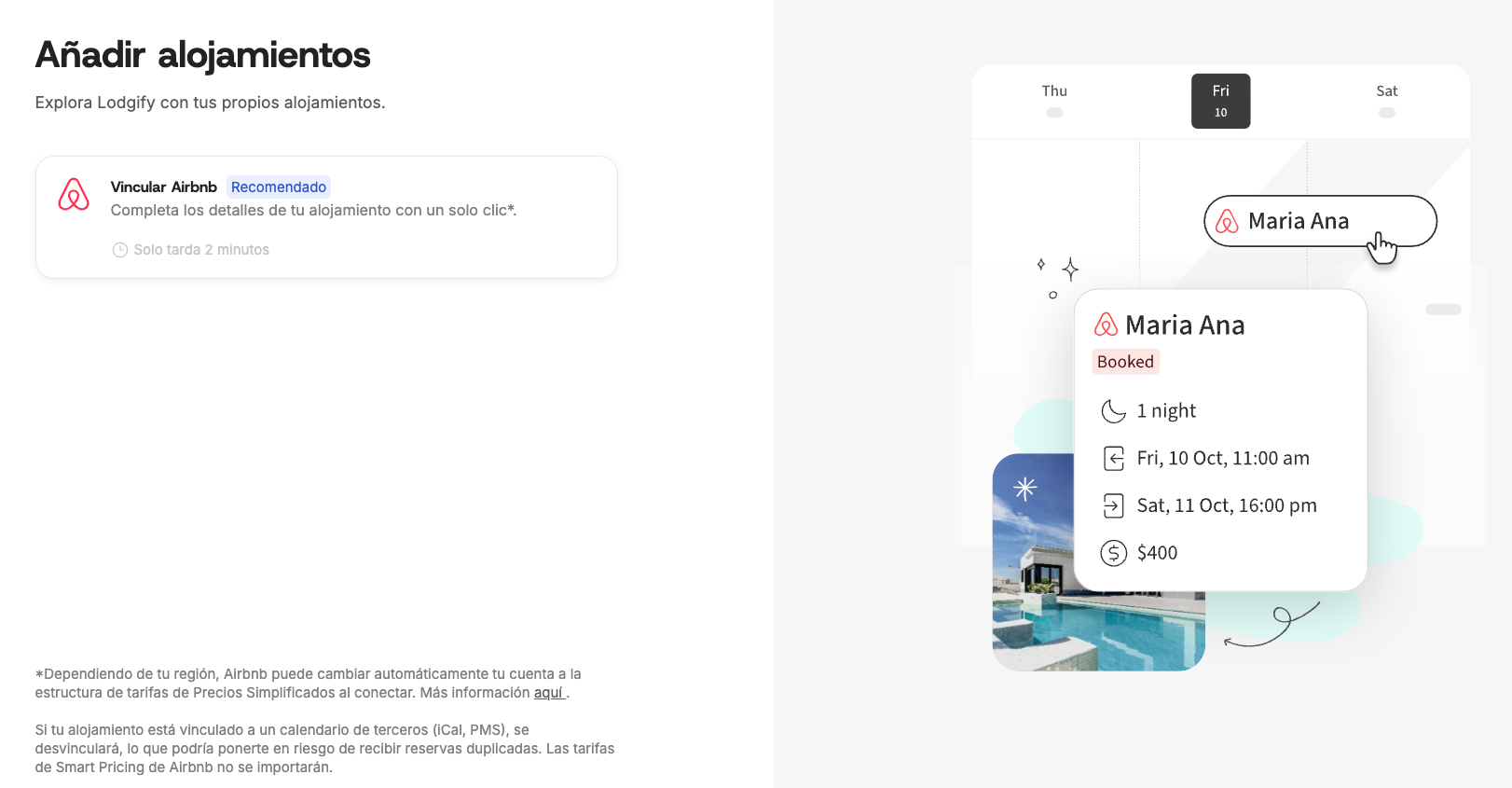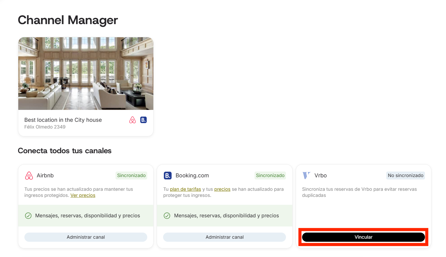 Si tienes un alojamiento, puedes usar un flujo de conexión simplificado que te permite conectar tu propiedad a Airbnb, Booking.com y Vrbo en un solo proceso.