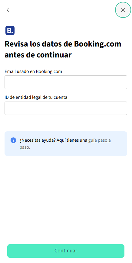 - Introduce tu Correo electrónico de Booking.com y el ID de entidad legal de tu cuenta (disponible en tu Extranet de Booking.com).